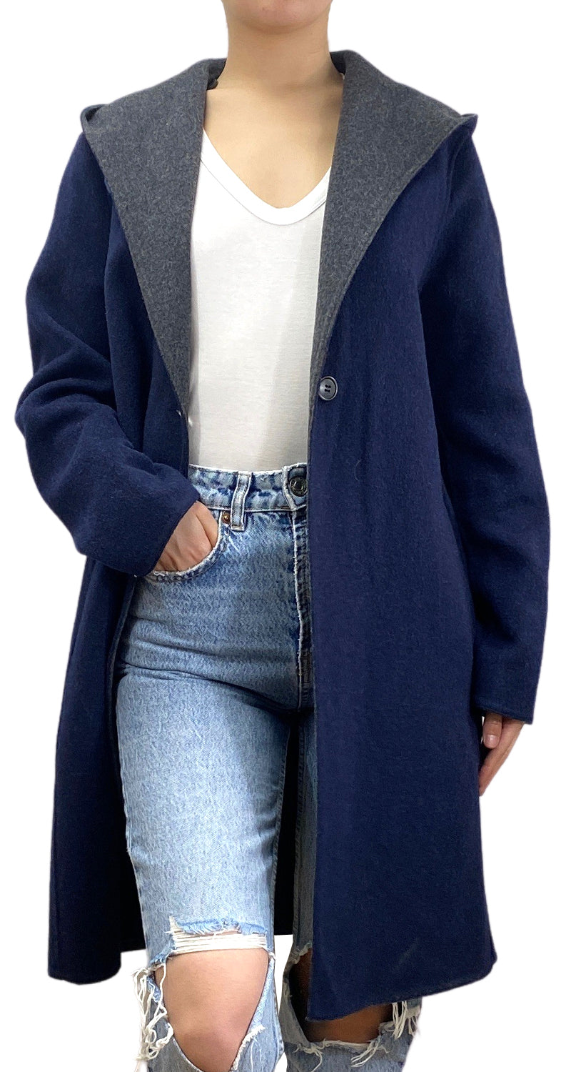 Abrigo color Azul de Lana con capucha, bolsillos y botón frontal.
