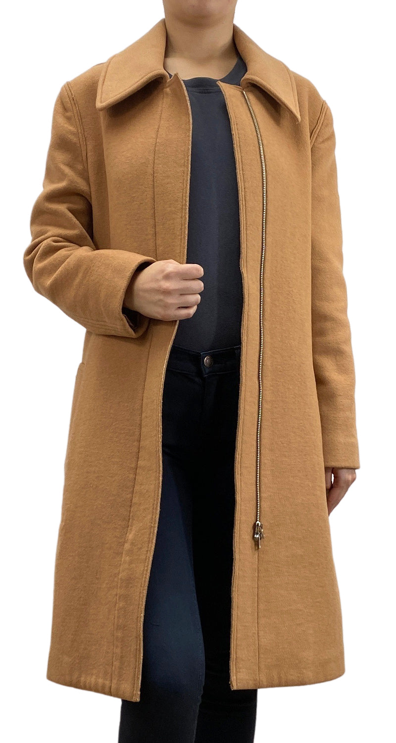 Abrigo color Beige con cierre frontal y bolsillos. Altura de modelo 1,68