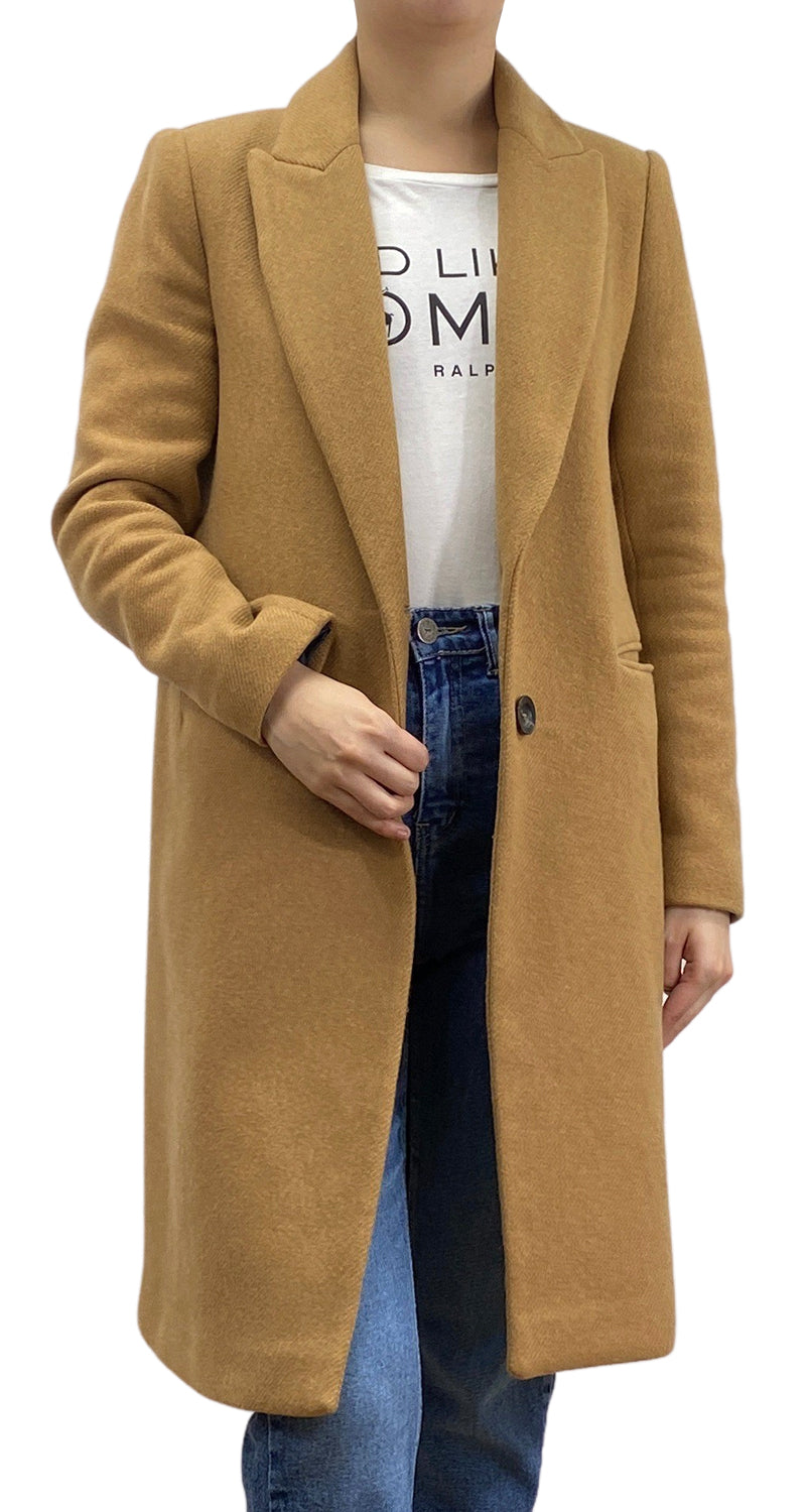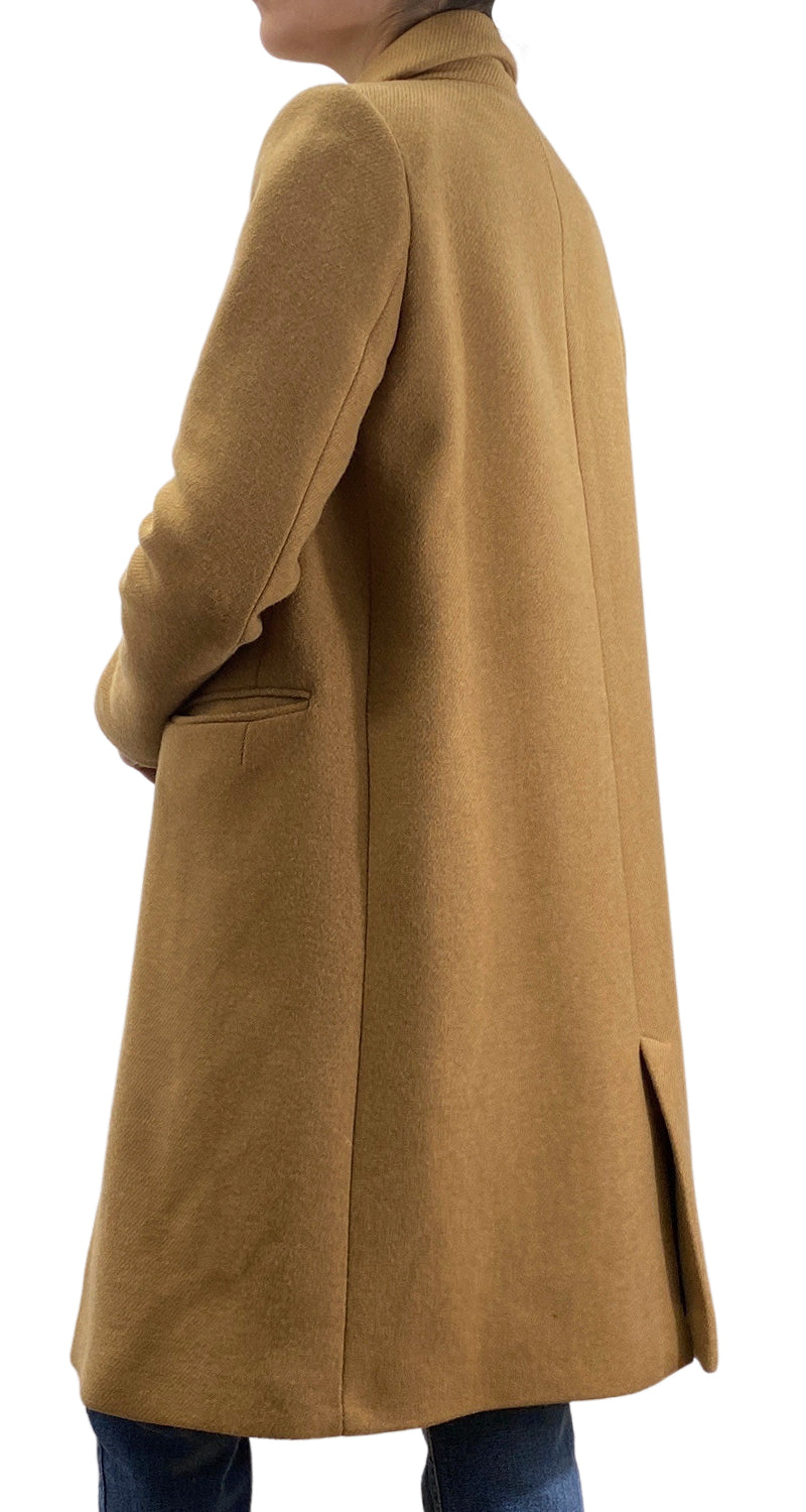Abrigo color Café con cuello de solapas y bolsillos frontales.