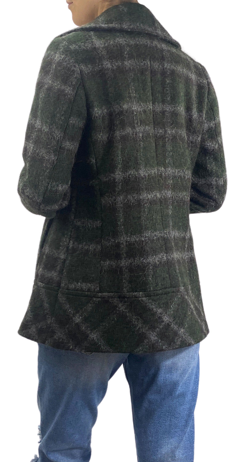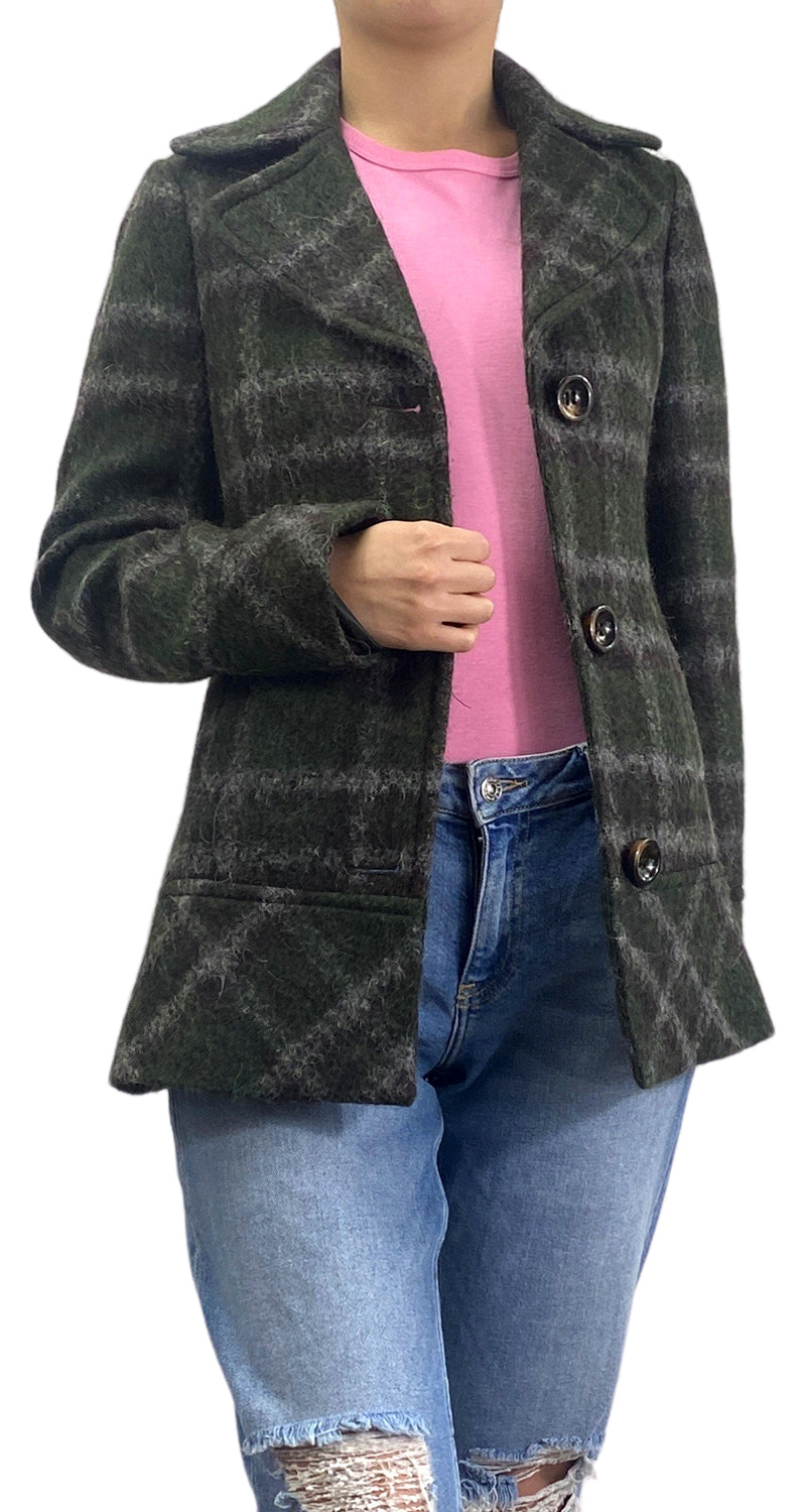 Abrigo a cuadros en color Verde, tres botones y bolsillos laterales.