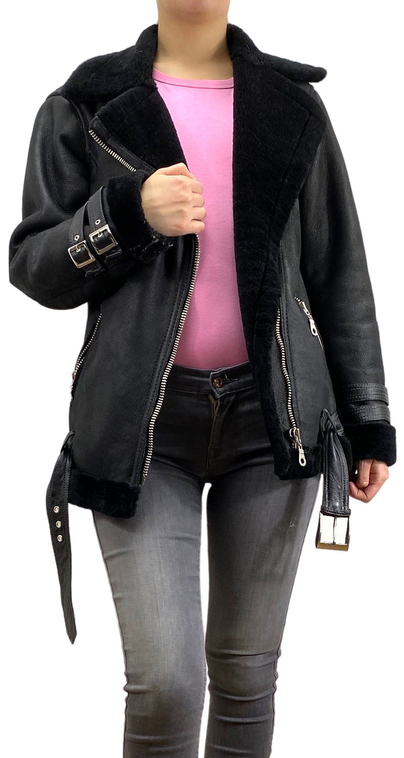 Abrigo color Negro de cuero con bolsillos frontales. El producto no especifica talla.