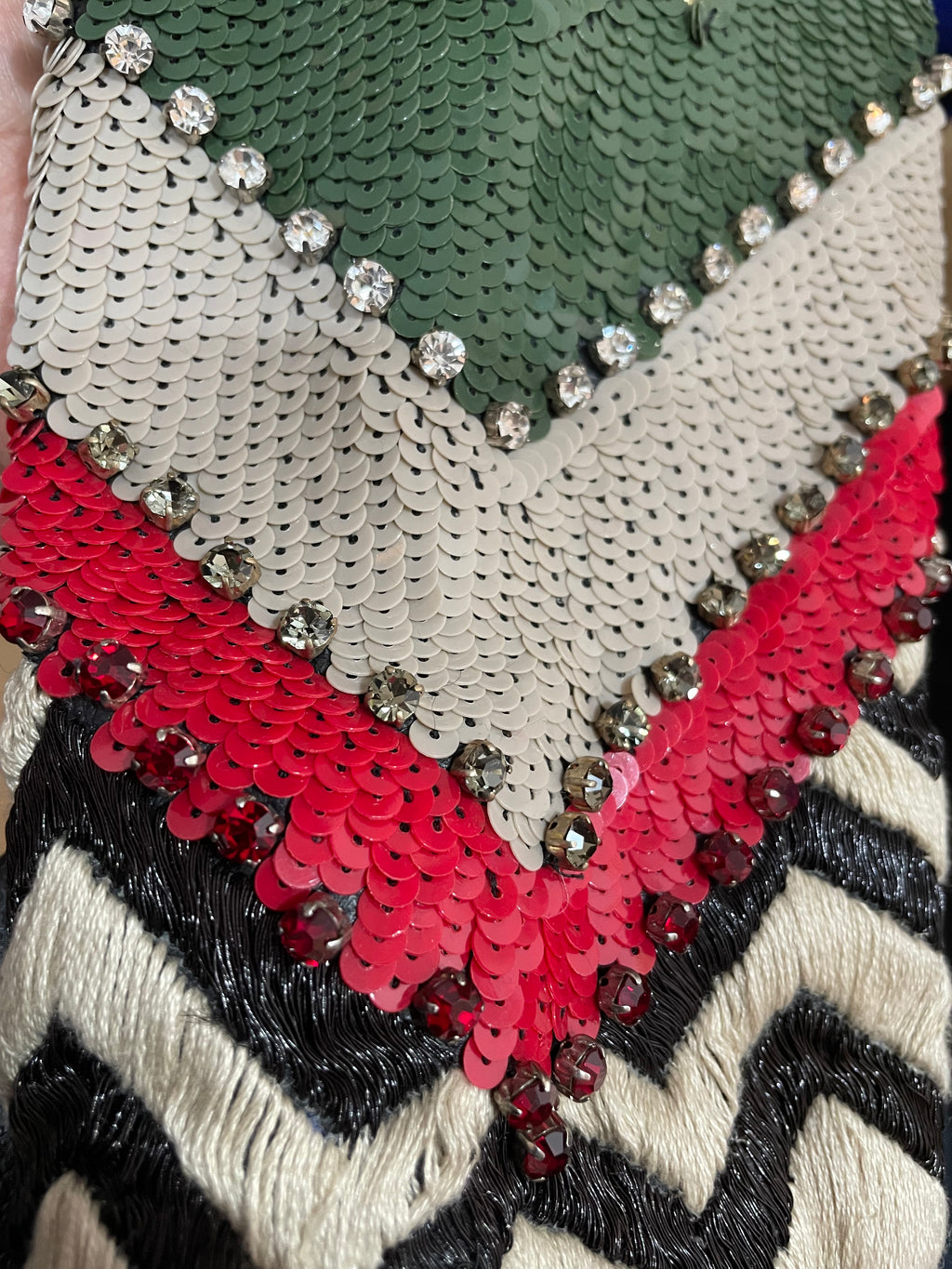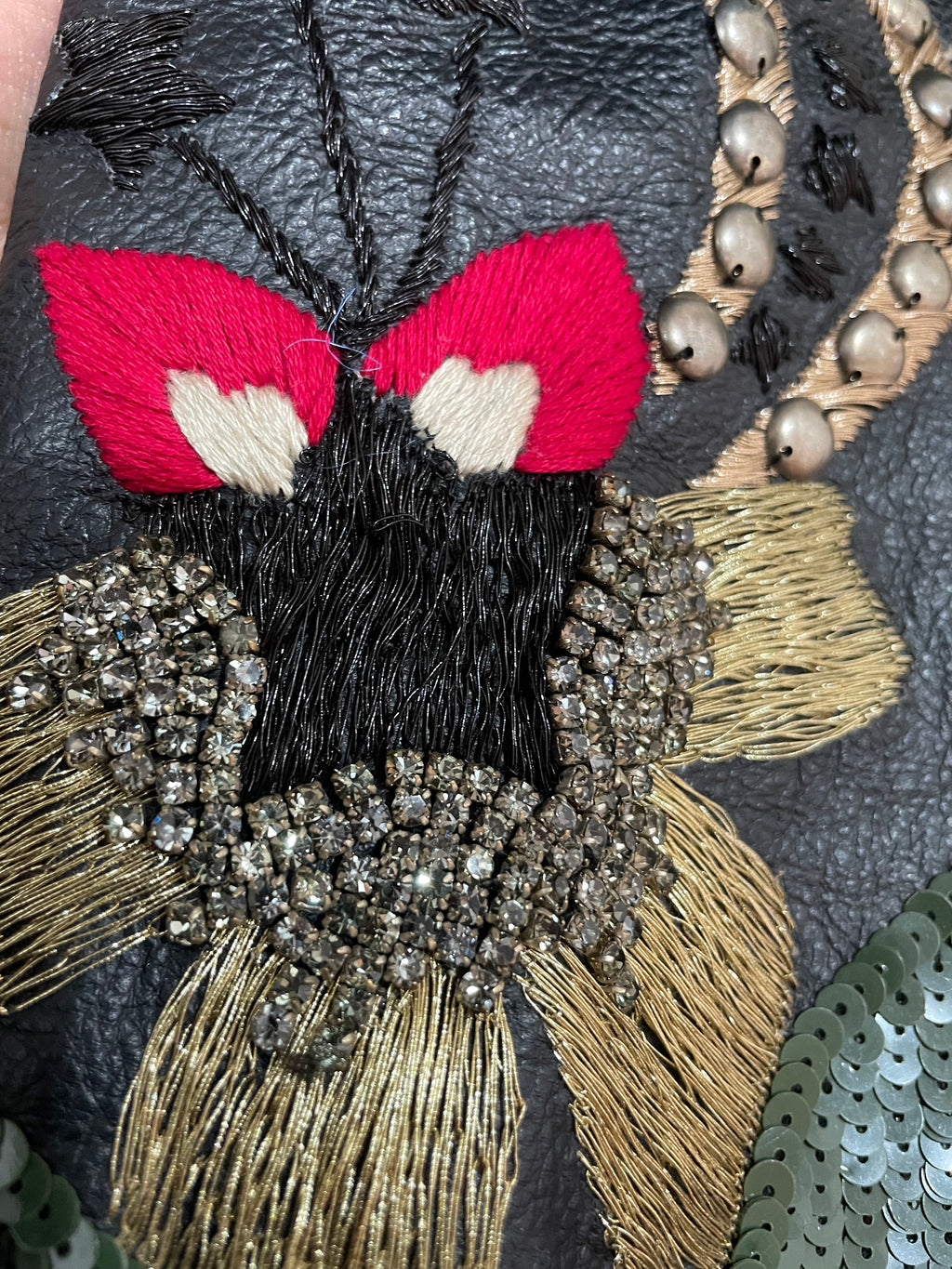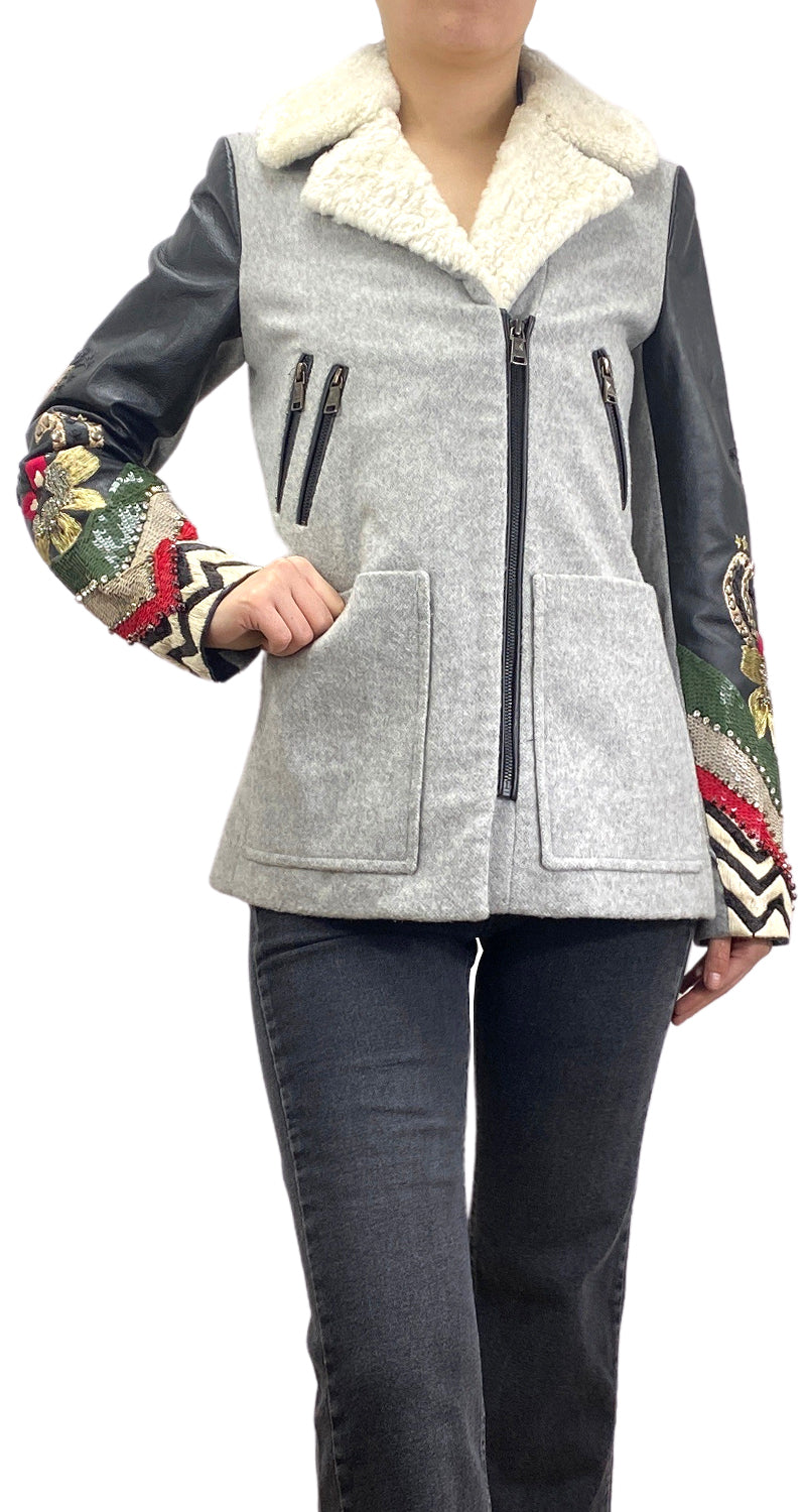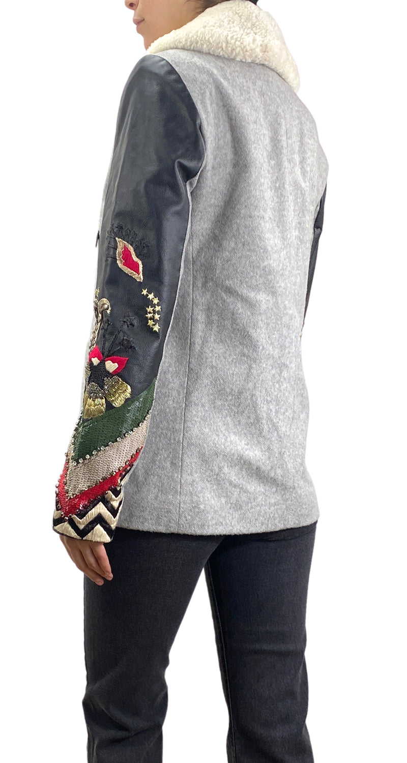 Abrigo color Gris con mangas de cuero en color Negro y estampado bordado con aplicaciones de lentejuelas y brillantes, solapa de chiporro, 5 bolsillos. Talla 40/1 de la marca.