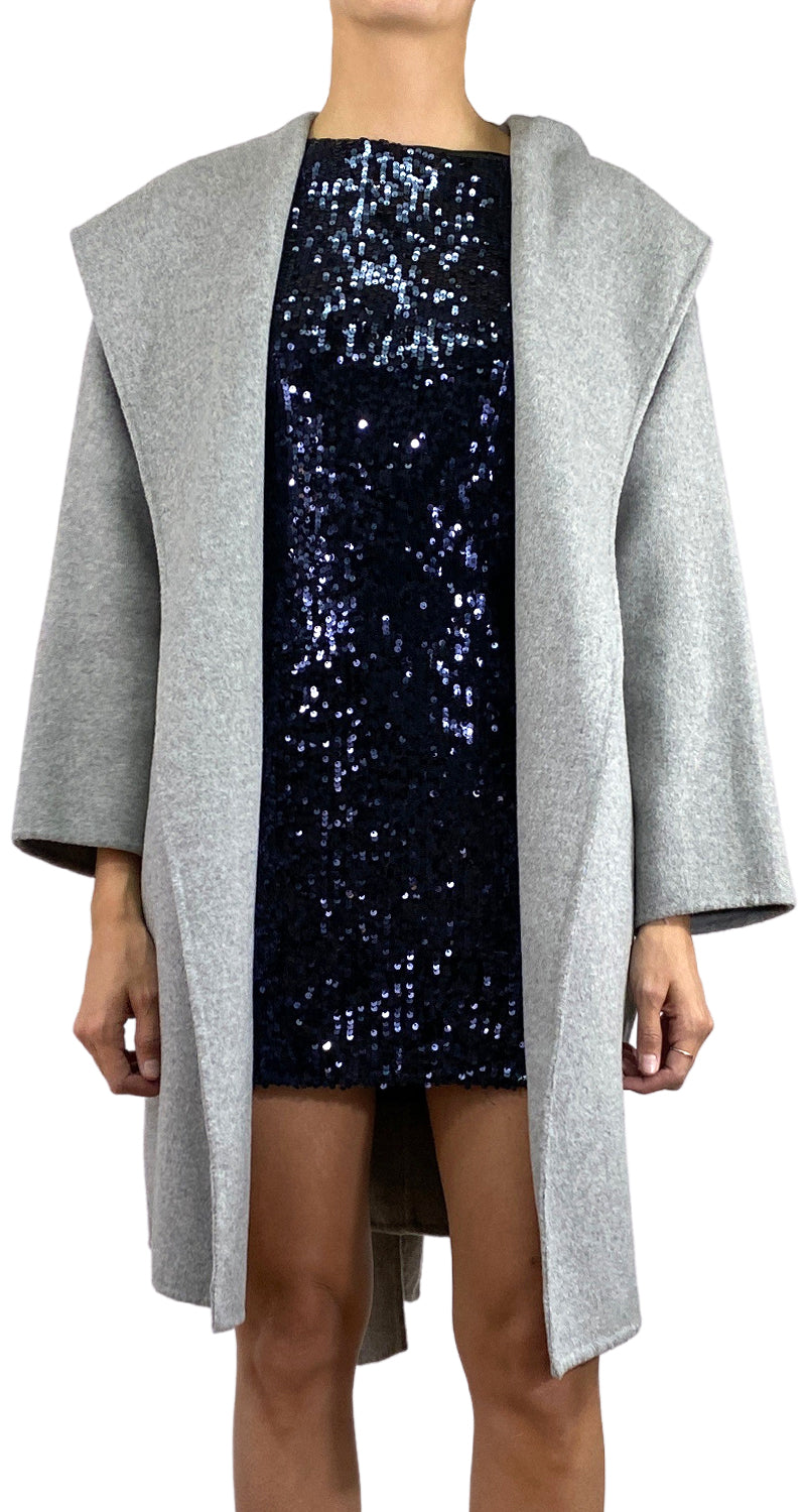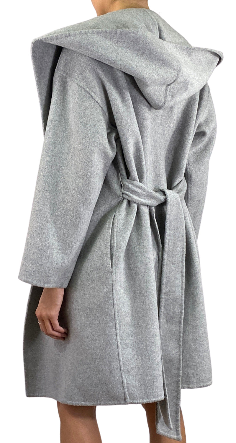Abrigo Gris con correas ajustables en cintura y capucha.