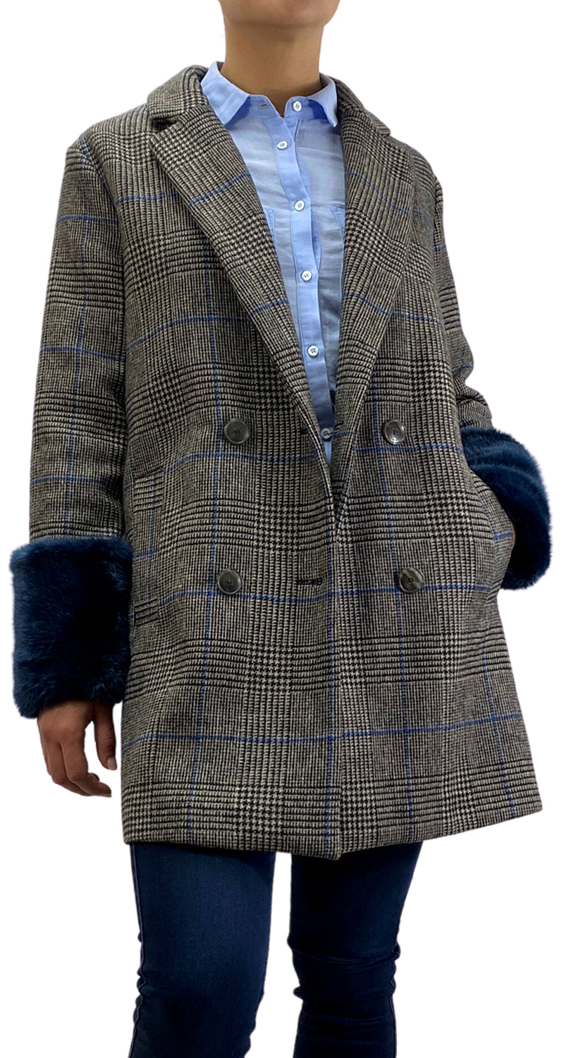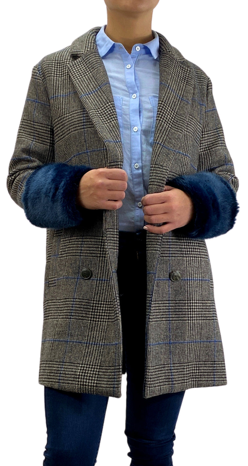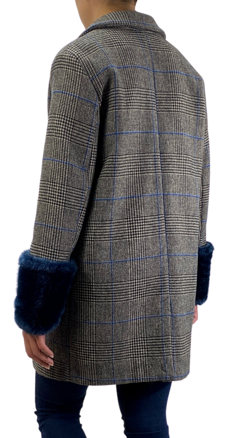 Abrigo color Gris con diseño de estampado Houndstooth, bolsillos frontales y detalle de piel sintética en mangas.