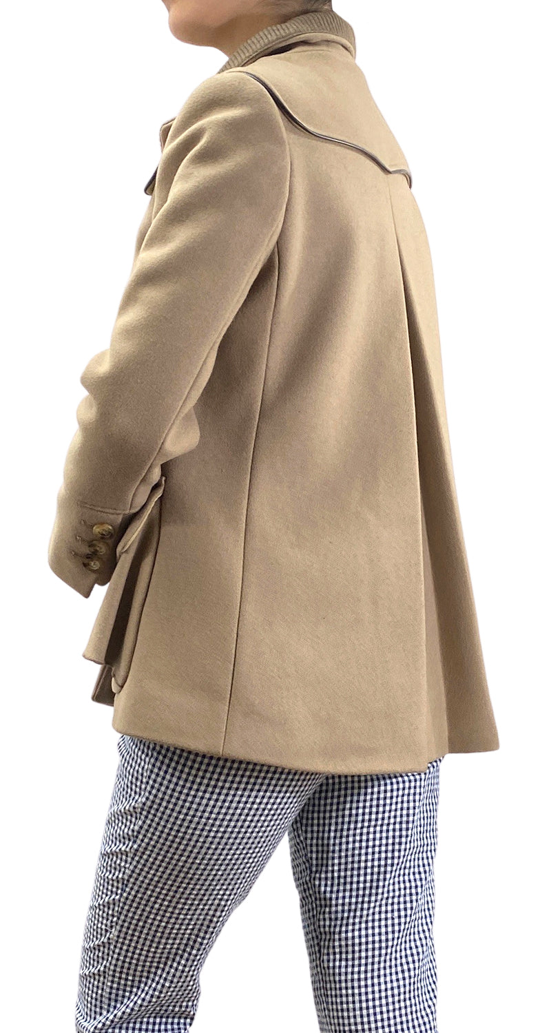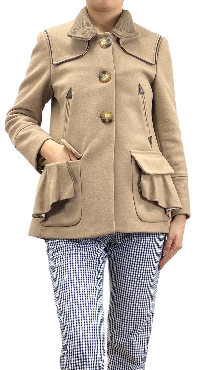 Abrigo color Beige de Lana con bolsillos frontales y vuelos, con detalles en Cuero. Talla 1 de la marca.