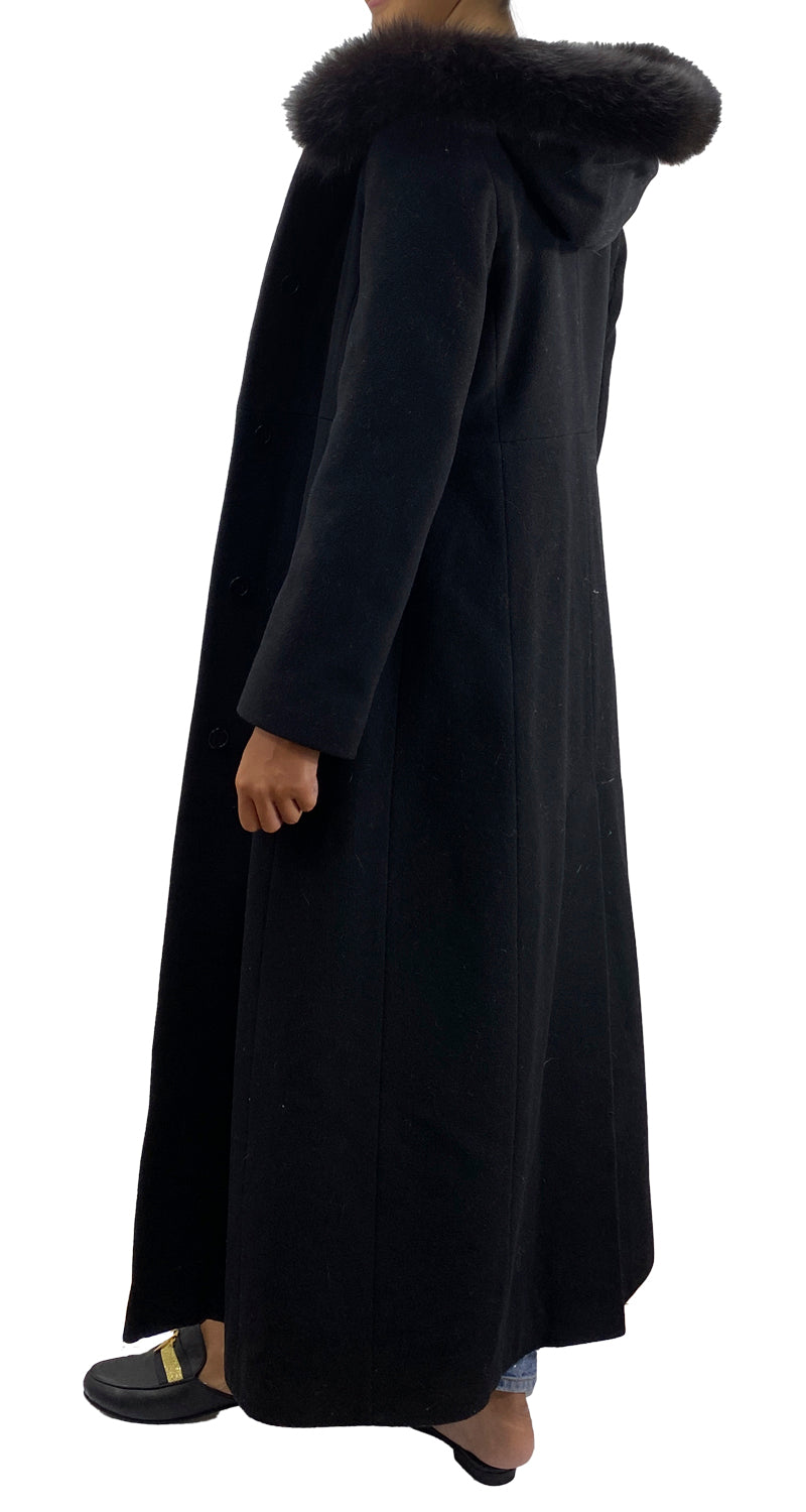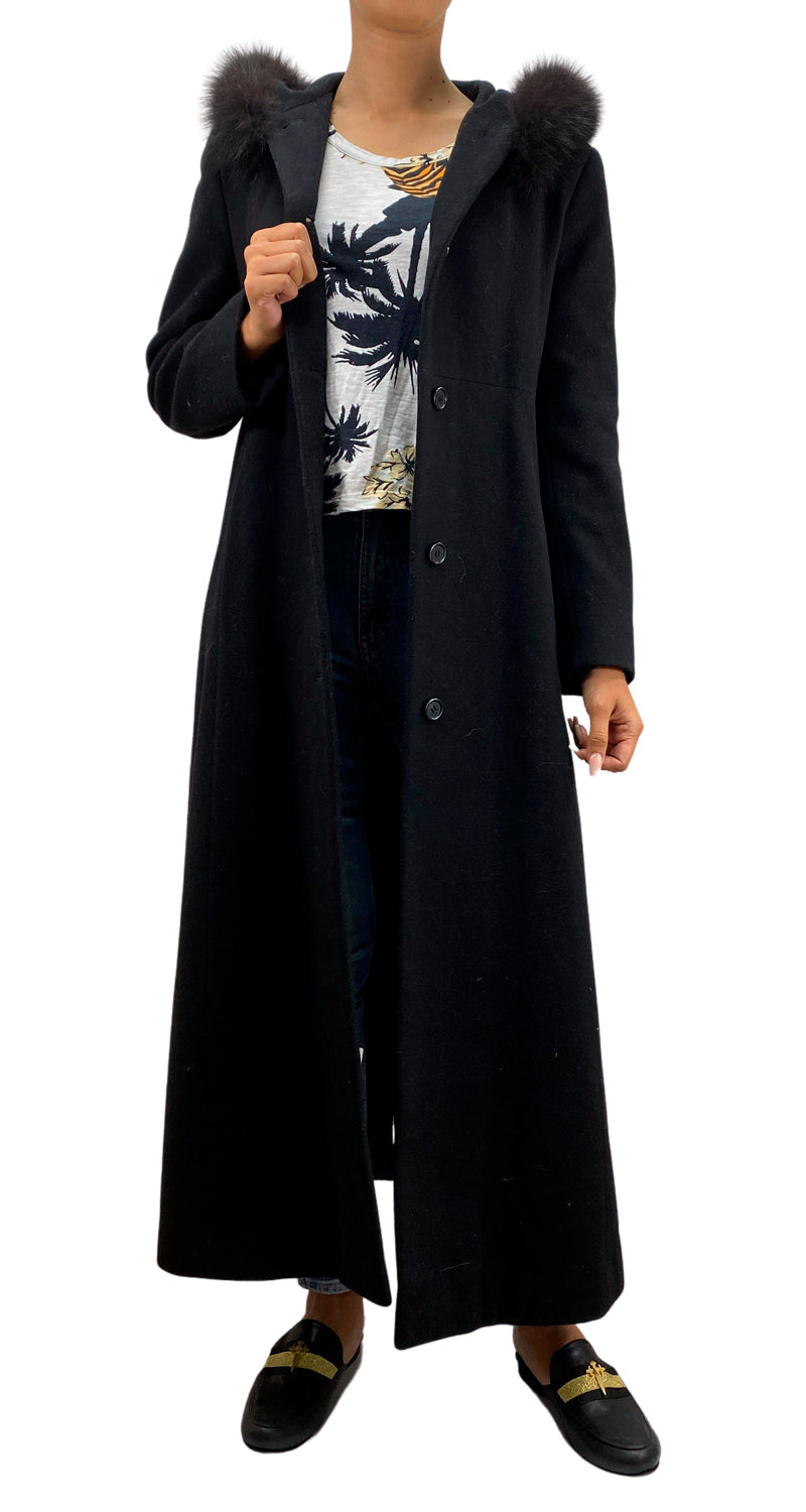 Abrigo largo color Negro con piel de zorro en cuello, botones en delantero y bolsillos laterales. Talla 8 de la marca. Altura de modelo 1,68