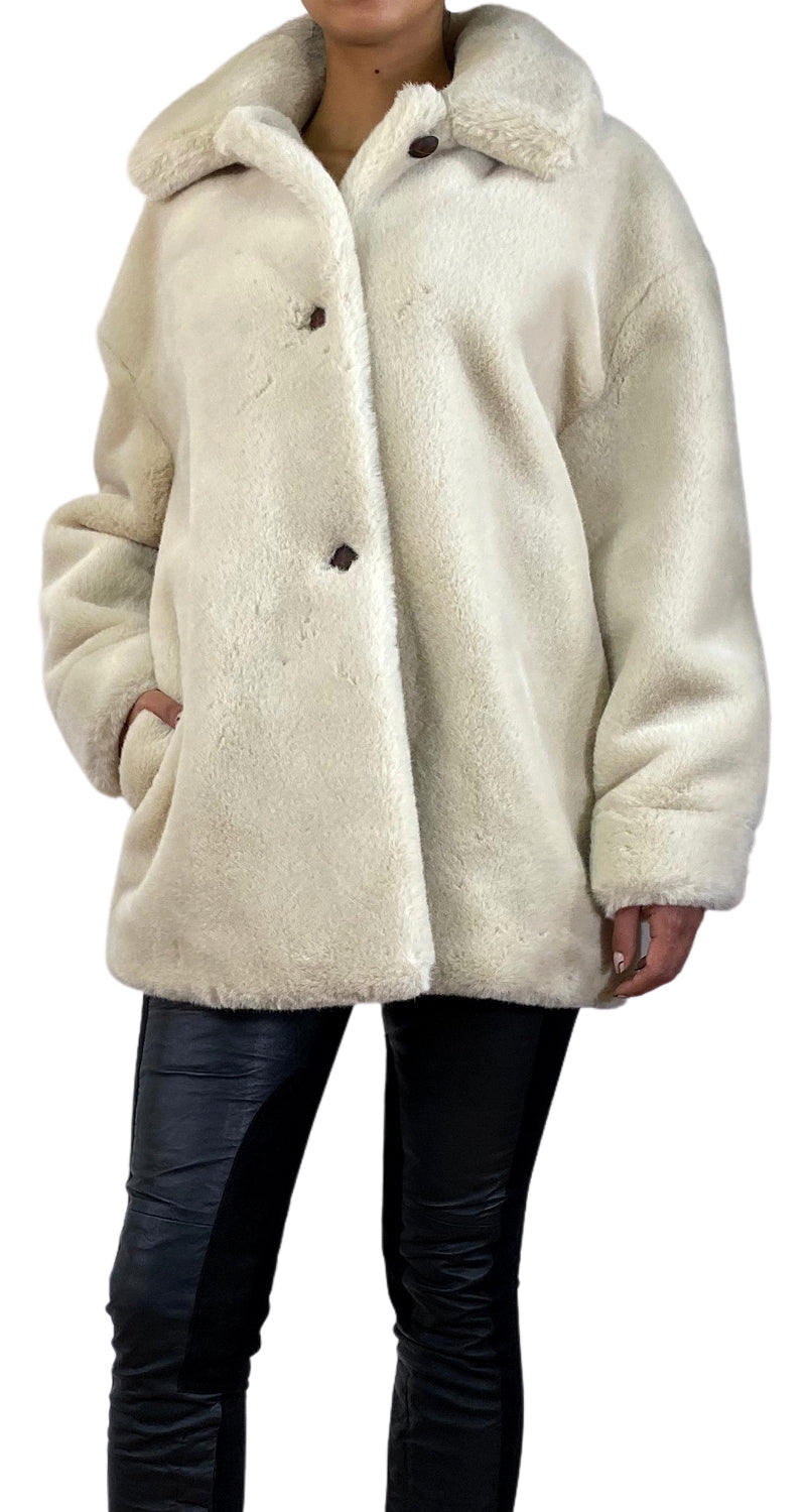 Abrigo de piel beige, manga larga y botones en delantero. Talla M