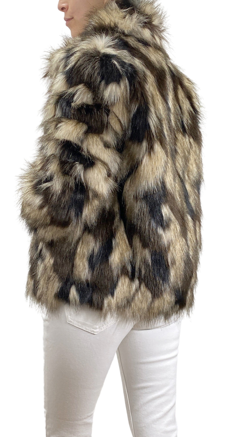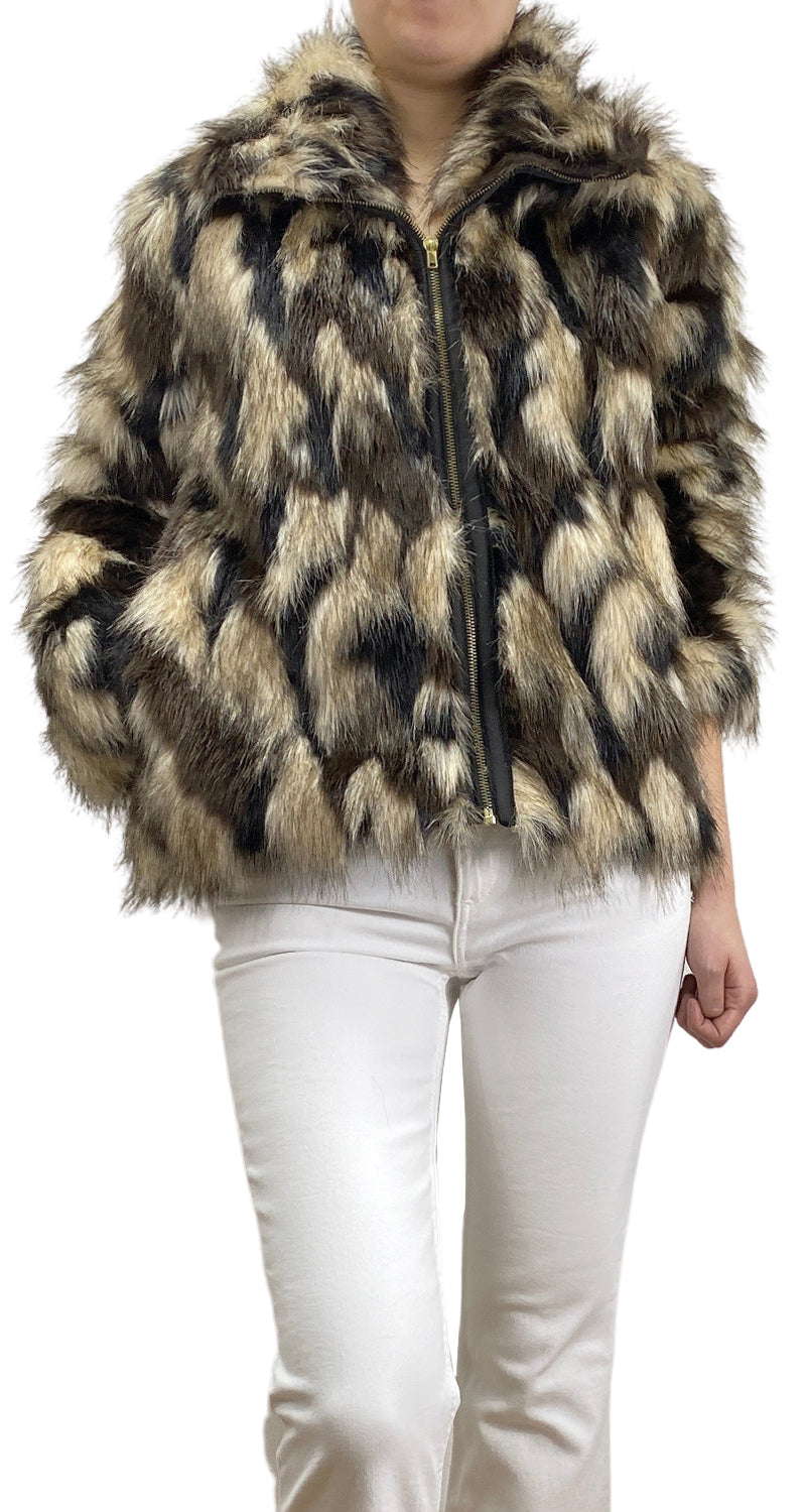 Chaqueta de piel sintética en color Café, Negro y Beige, cuello alto, bolsillos laterales y cierre frontal.
