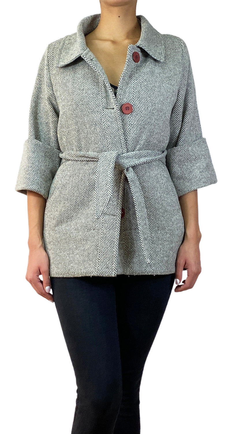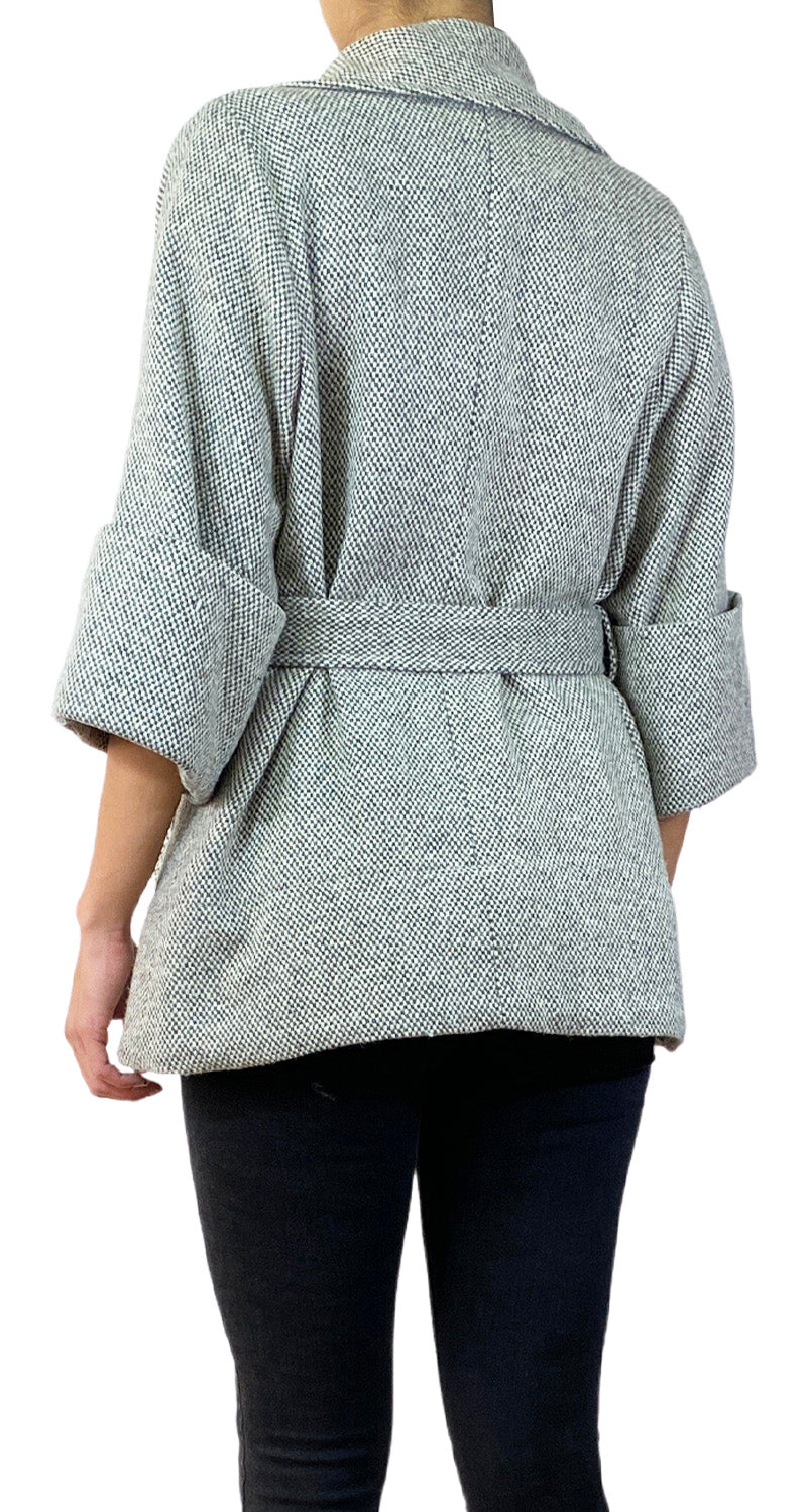 Abrigo color Beige y Gris, botones color Café en delantero, bolsillos frontales, lazo en cintura, mangas 3/4.