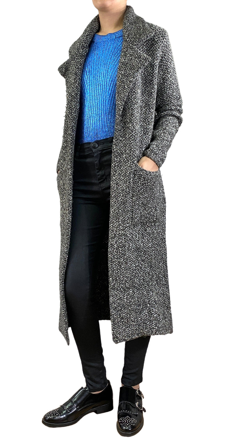 Abrigo abierto largo tejido color Gris, con bolsillos en delantero. Altura de modelo 1,68.