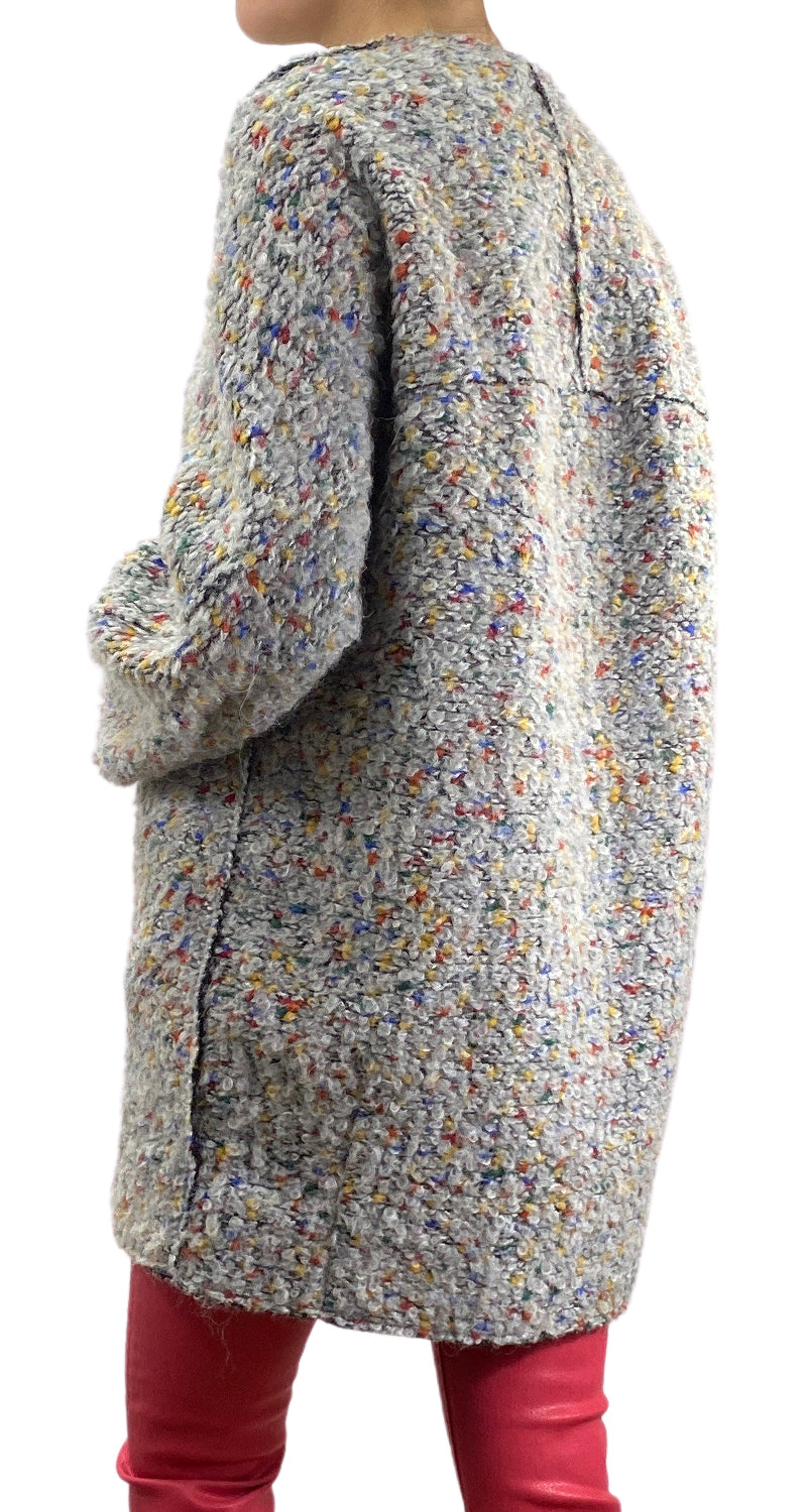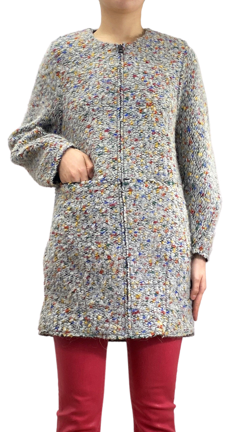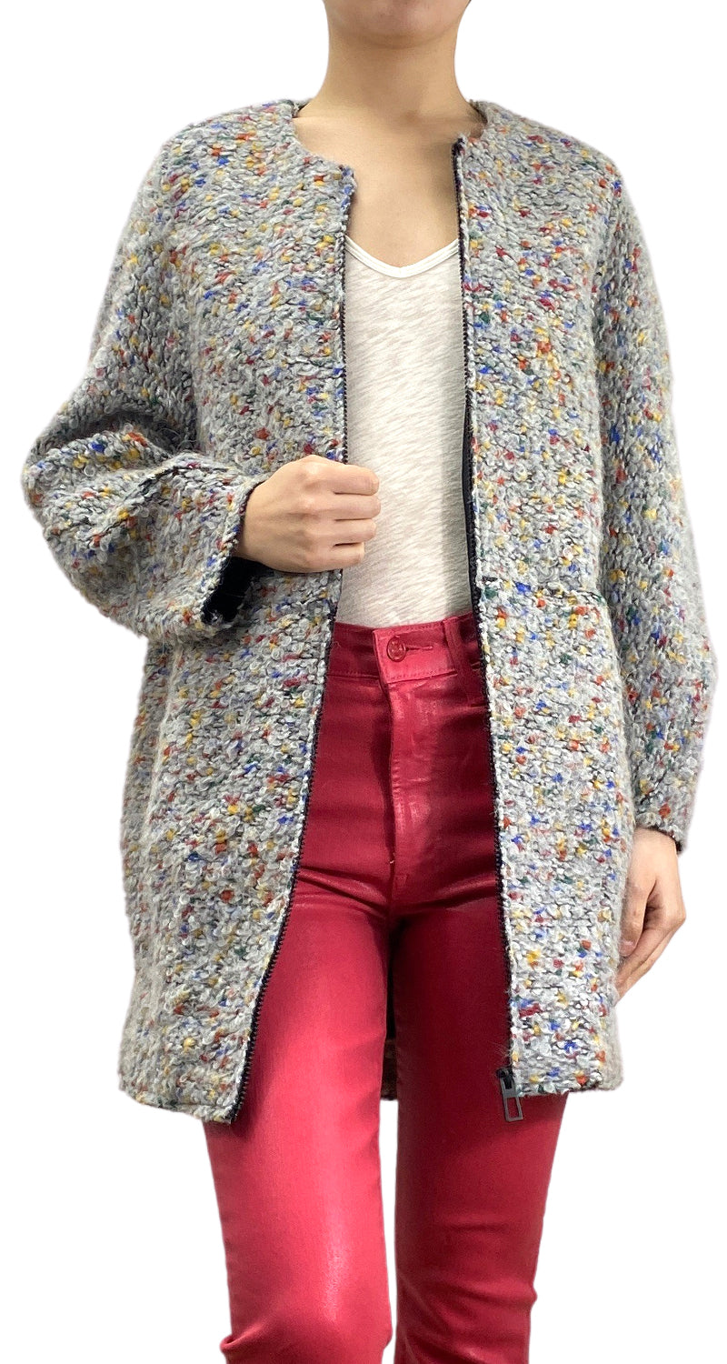 Abrigo color Gris con cierre, bolsillos frontales y detalle de tejido Multicolor.