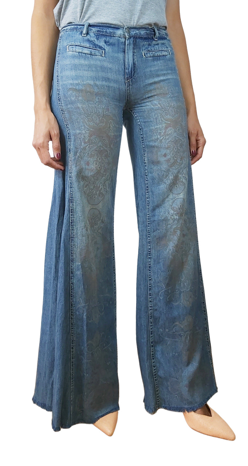 Jeans Azul efecto deslavado con ruedo desflecado y con estampado en delantero. Talla 25 americano