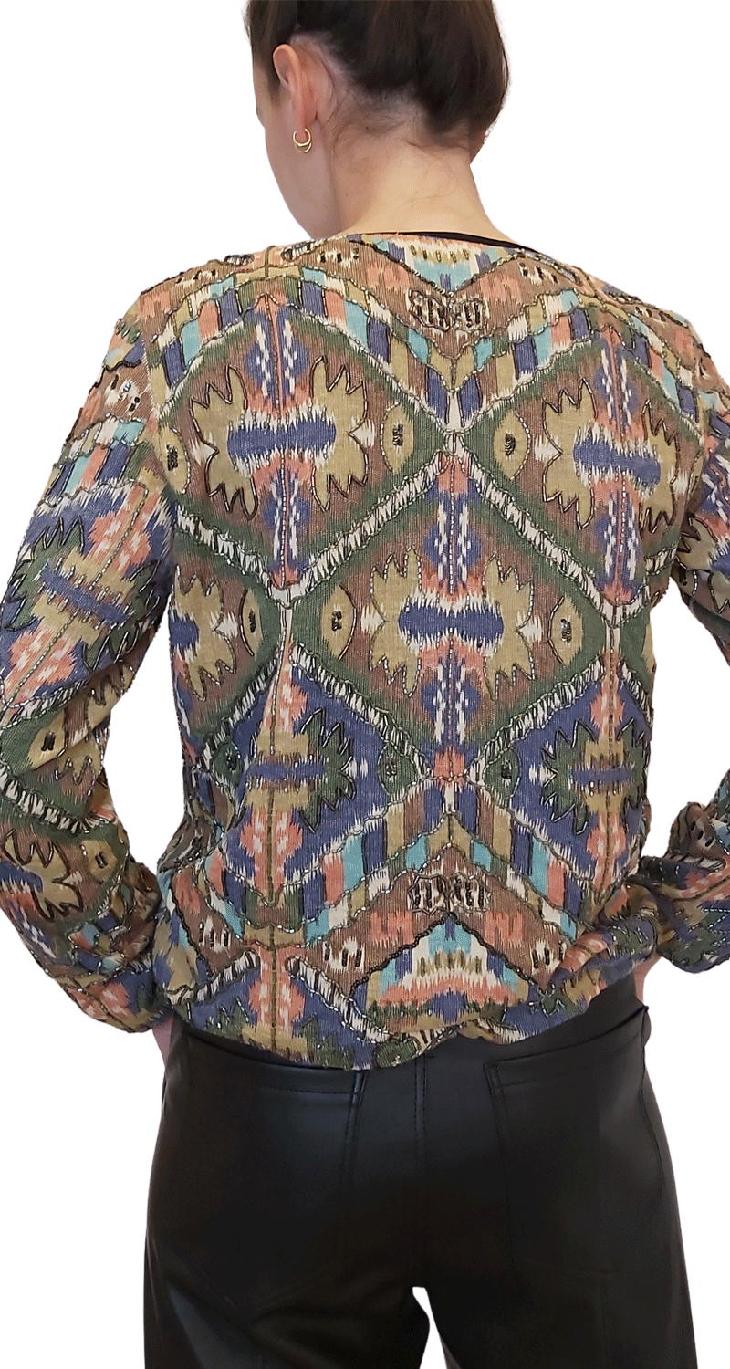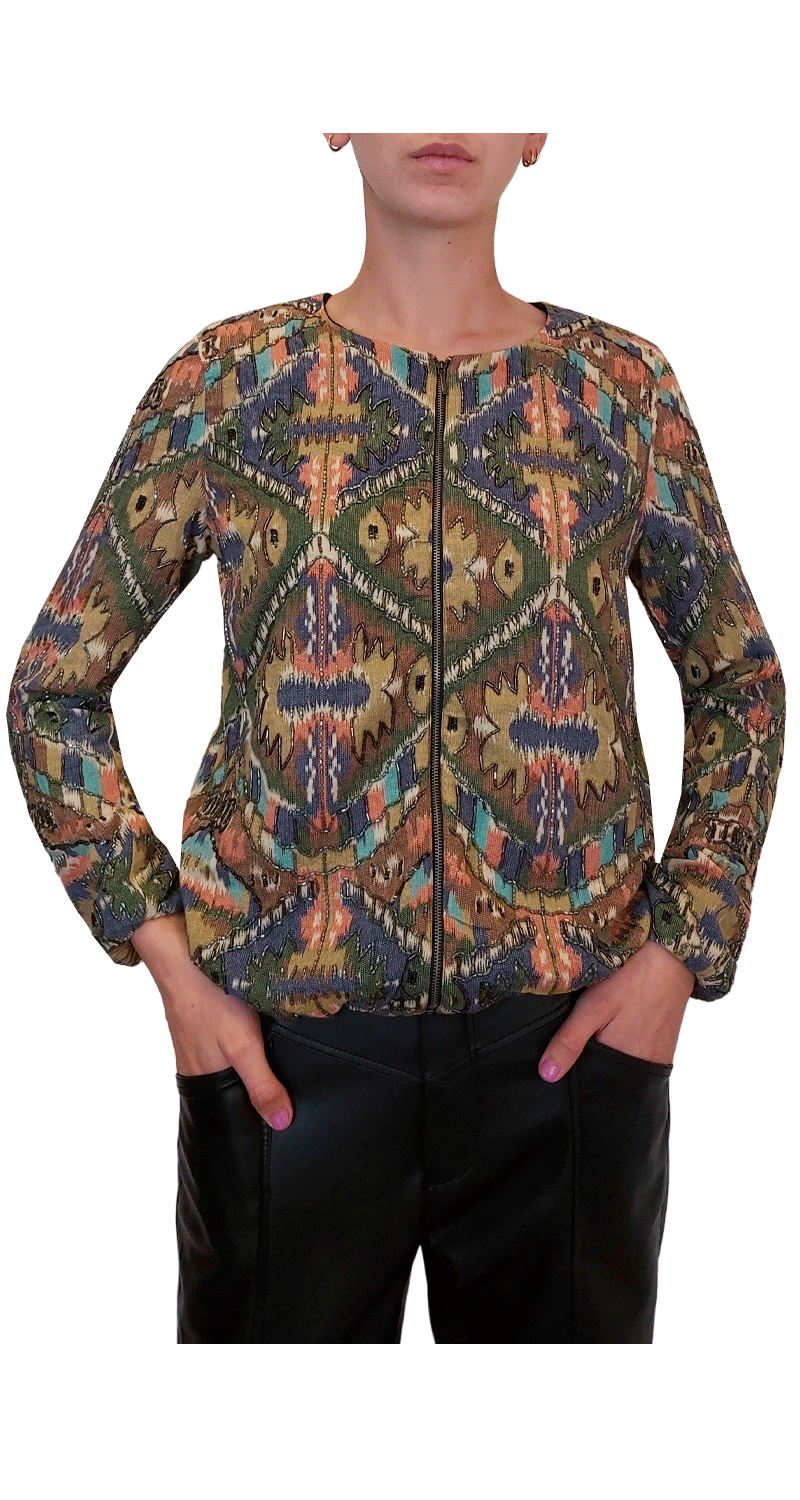 Chaqueta tipo bomber multicolor con aplicaciones de mostacillas y lentejuelas. Cierre en delantero. Faltan algunas mostacillas.
