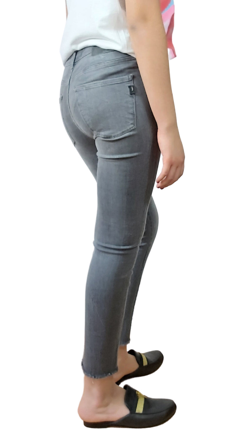 Jeans color Gris con efecto deslavado y ruedo desflecado, modelo 5 bolsillos. Leves signos de uso. Talla 41/25 de la marca. La talla 25 equivale a la talla 37.