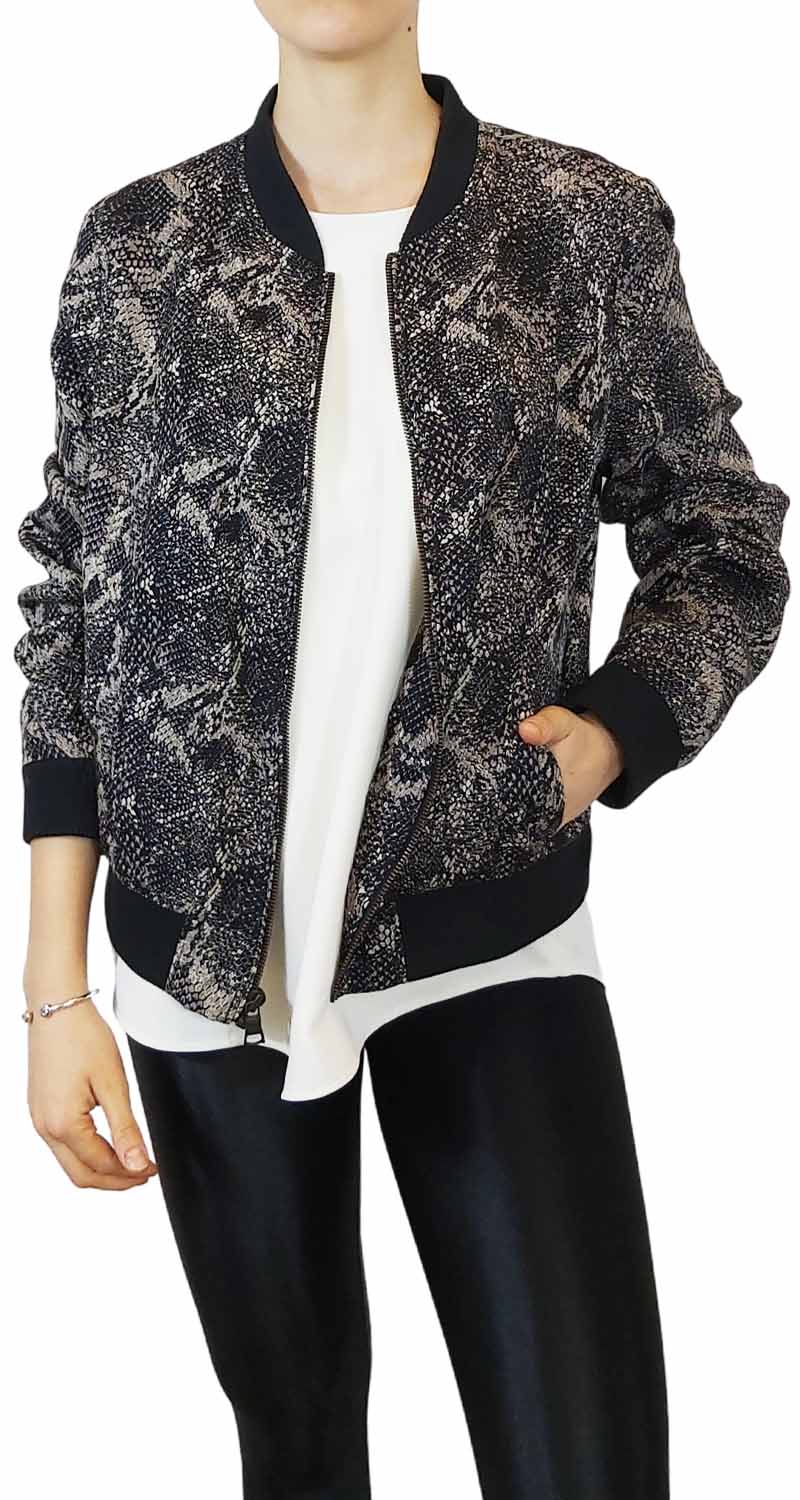 Chaqueta bomber Animal Print estilo Reptil con cuello, puños y pretina de Rib en color Negro.