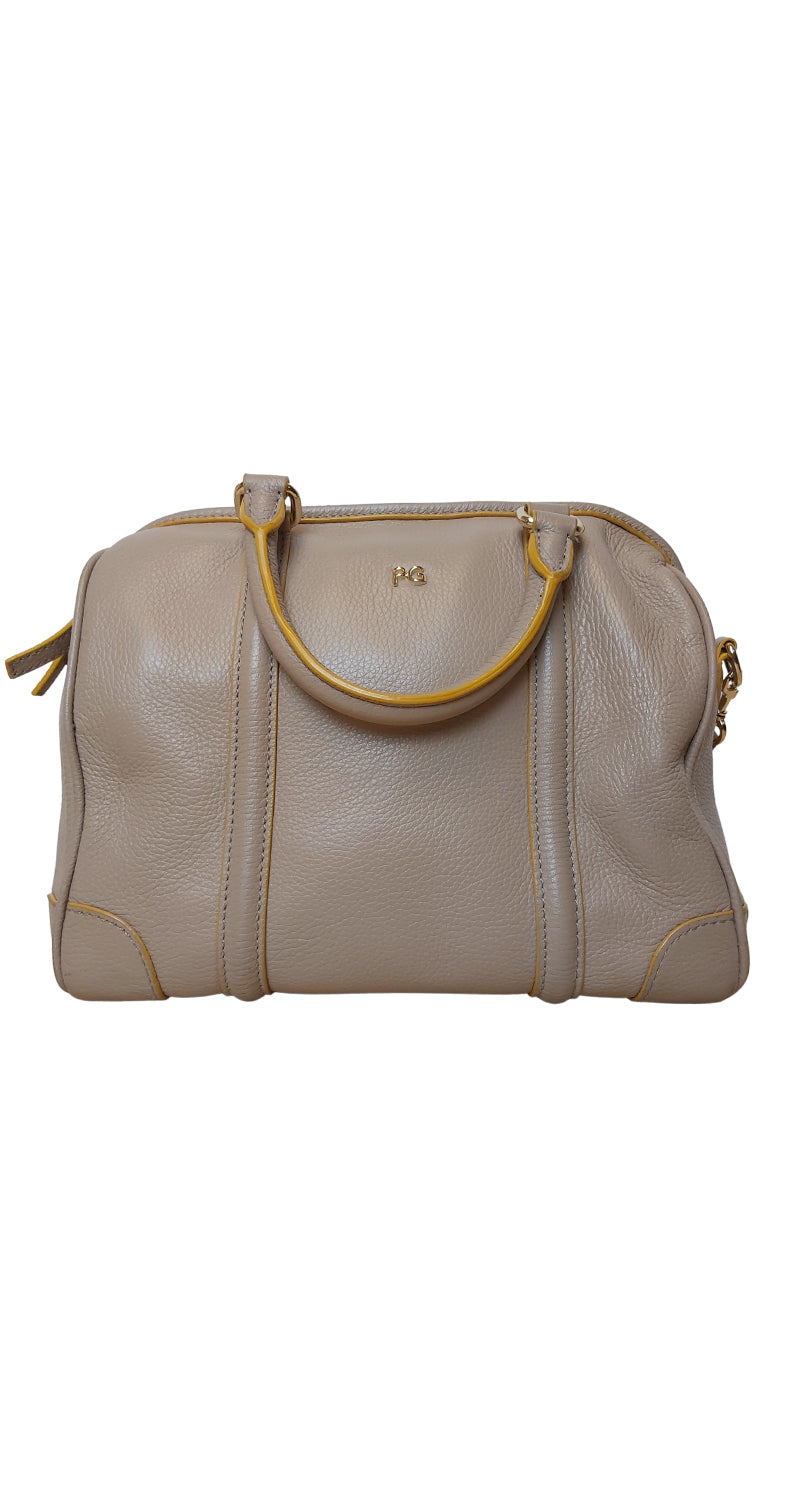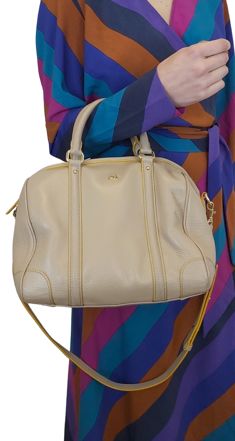 Bandolera color Beige con detalles en Amarillo y Dorado. Bolsillos internos. Signos de uso.