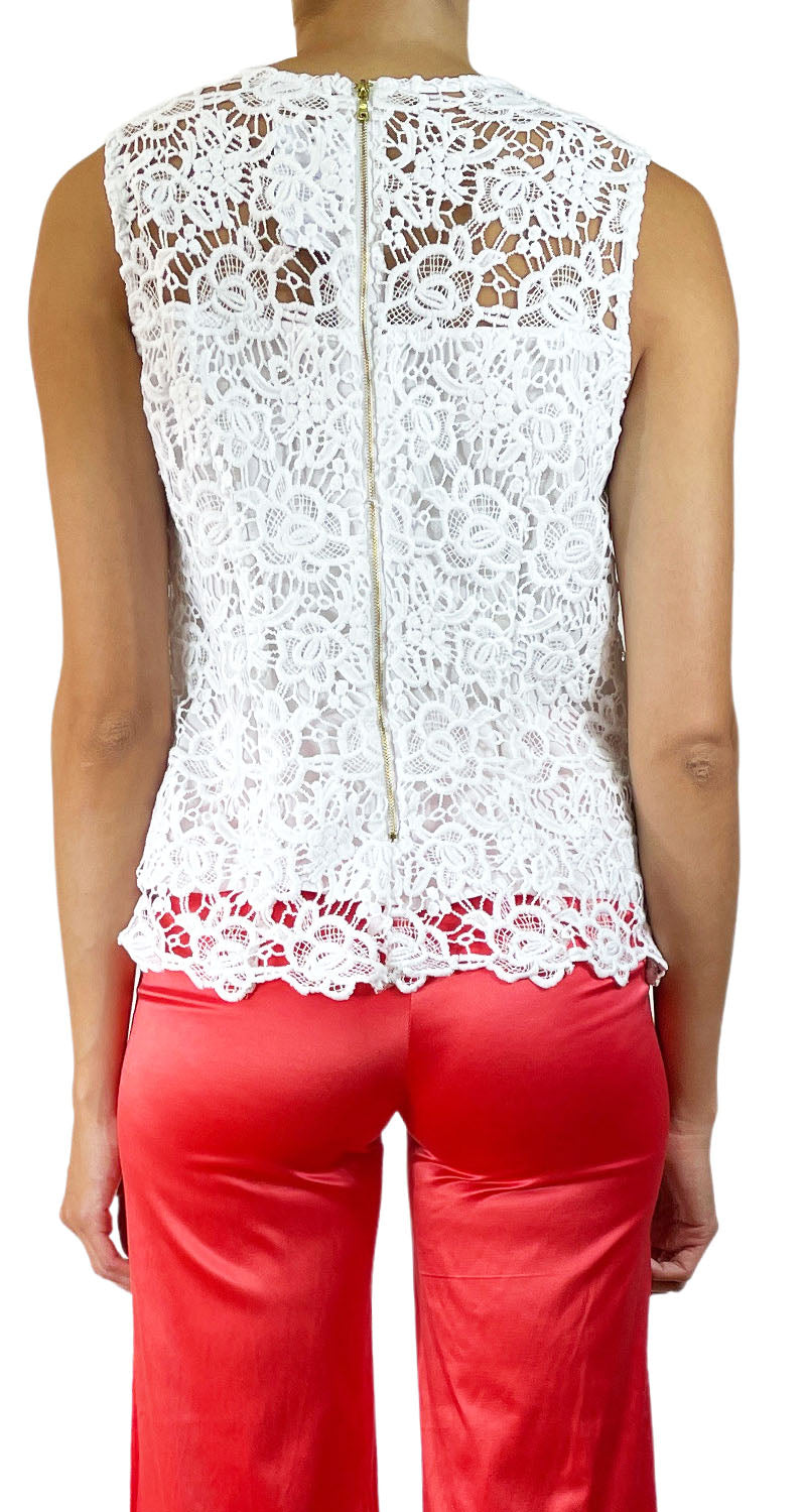 Blusa blanca con encaje de flores, cuello redondo y con cierre en centro espalda.