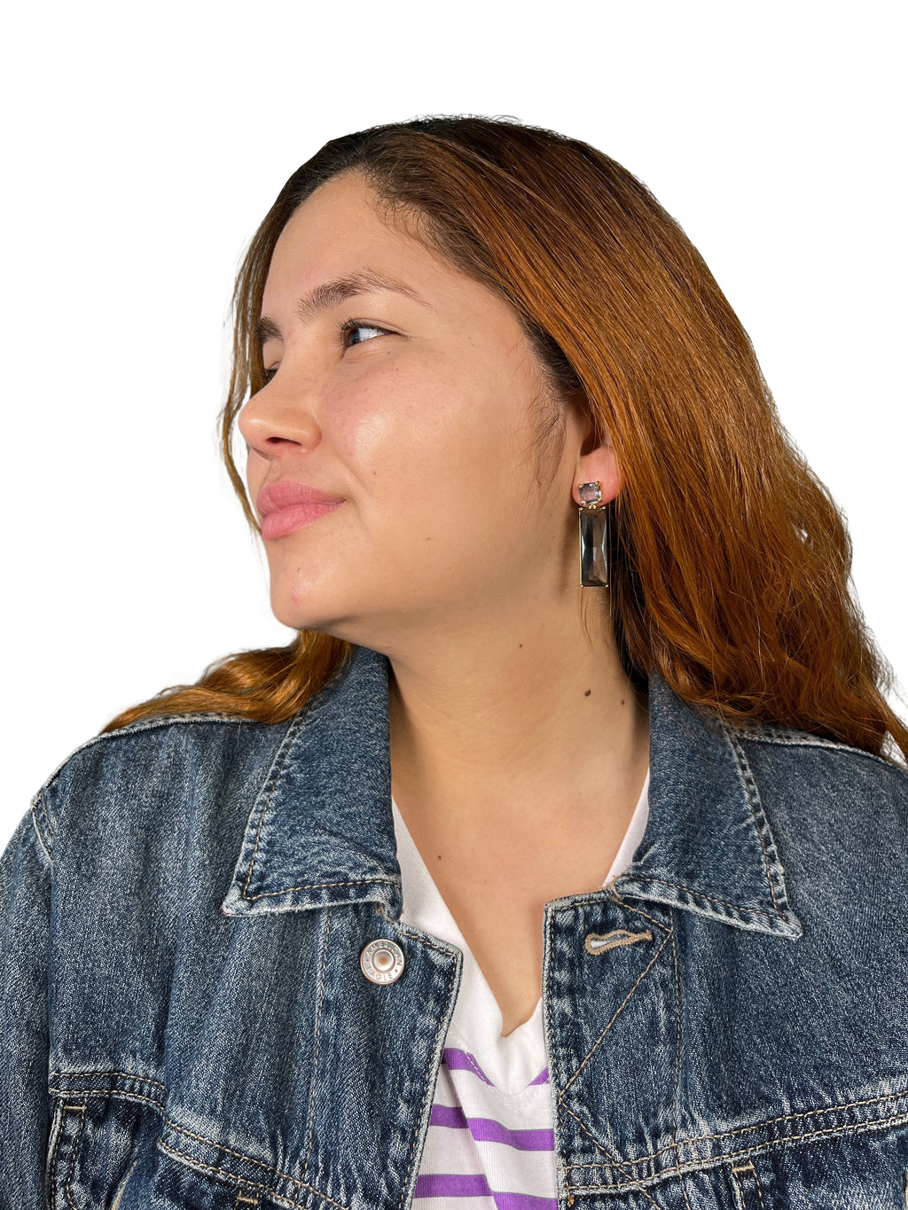 Aros bañado en oro con cristales en forma de cubo y rectángulo. Cierre tipo caja grabado con logo PG. Medida: 4.5 x 1 cm.