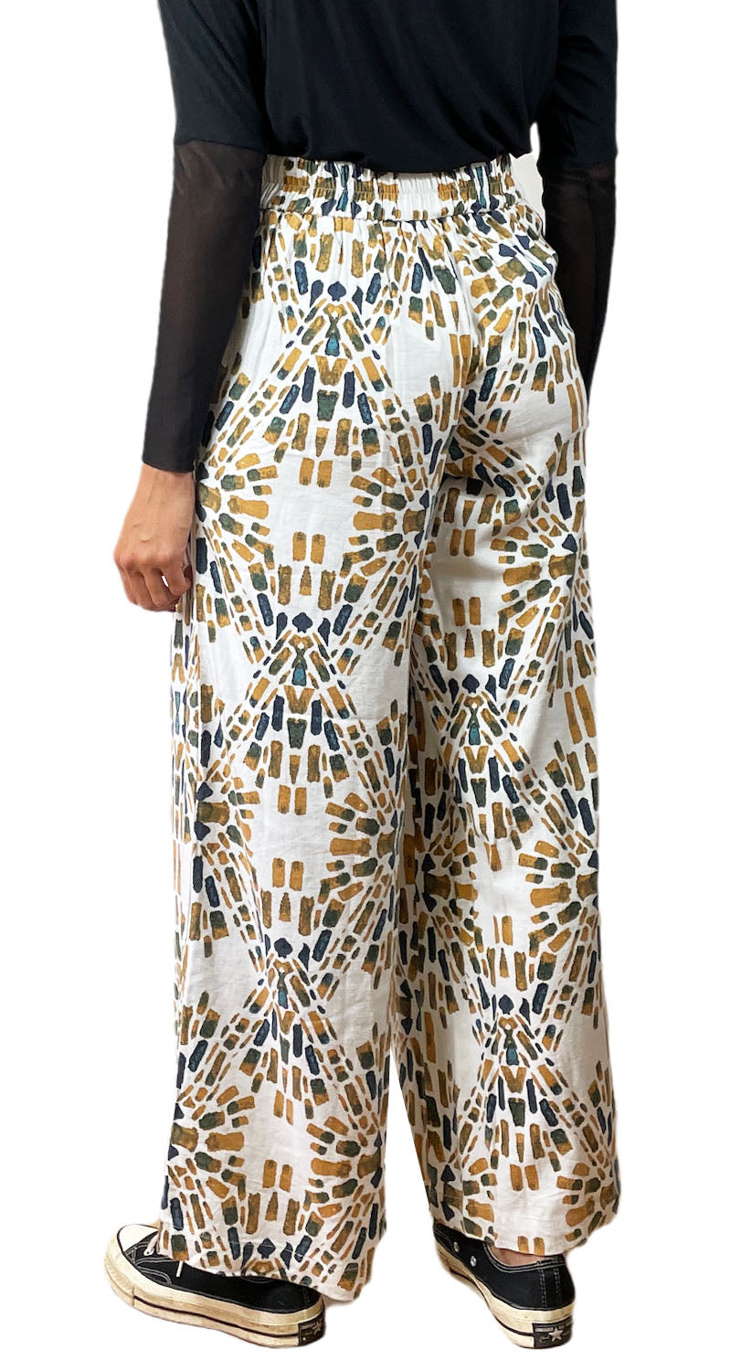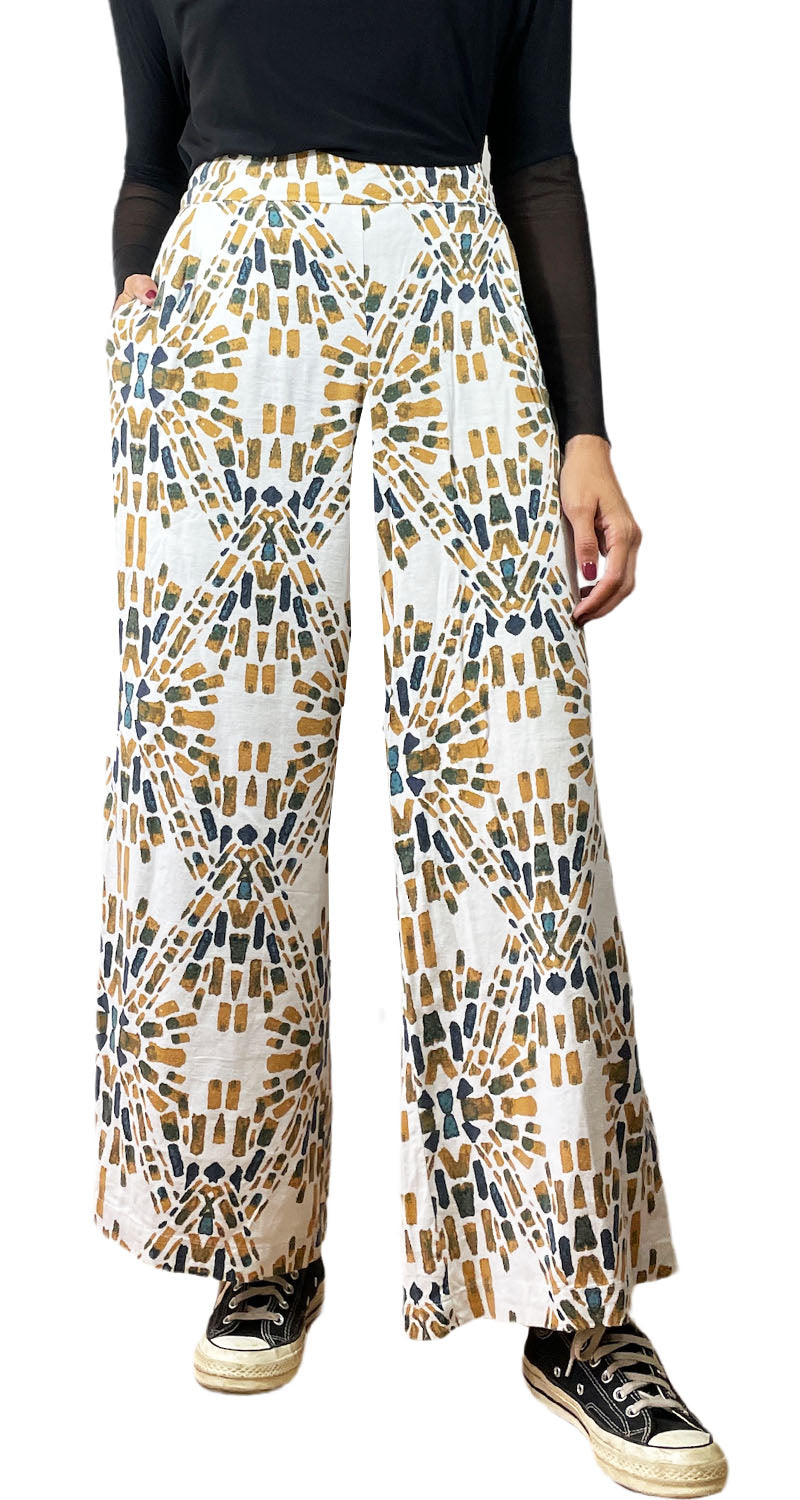 Pantalón Blanco estilo Palazzo, con estampado y pretina elásticada.