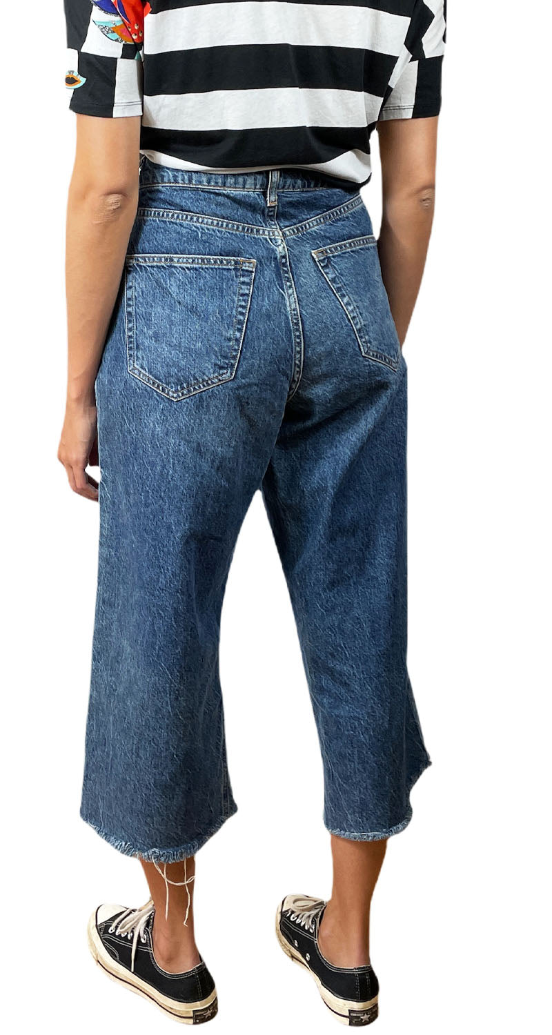Jeans corte 3/4 estilo Palazzo con ruedo desflecado, 5 bolsillos. Talla 42 Americana.