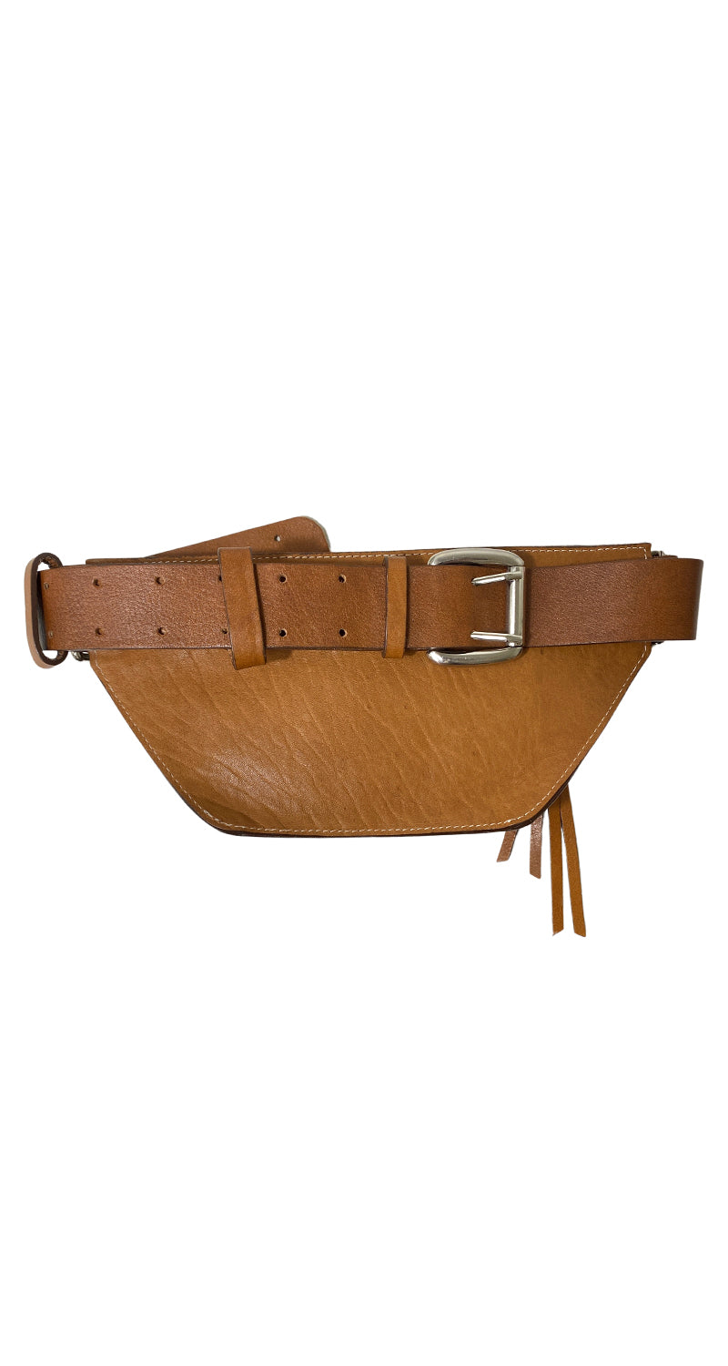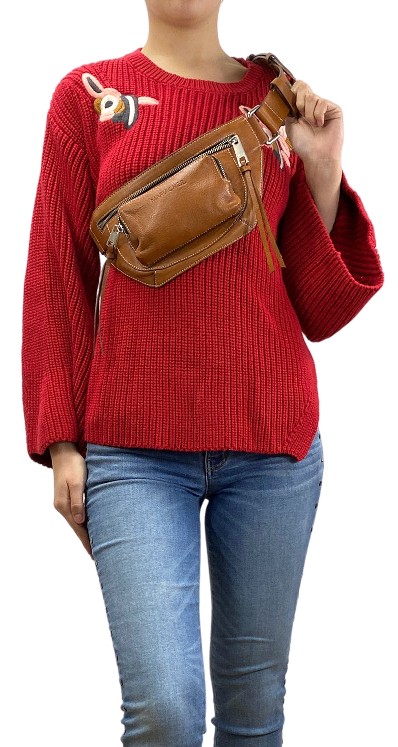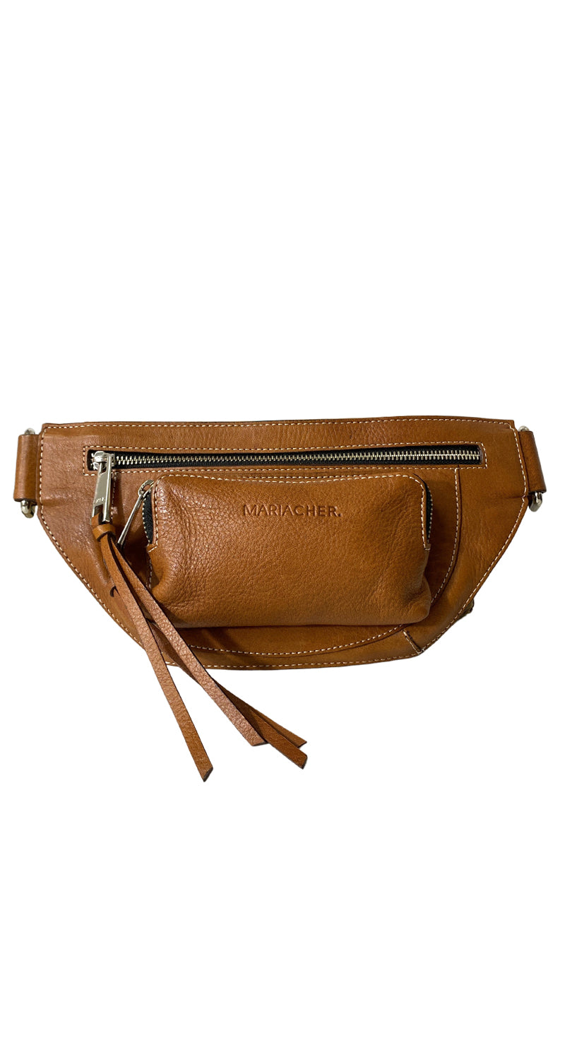 Banano de cuero color Café, corea ajustable con hebilla Plateada. Medidas: 29 x 14 x 4 cm.