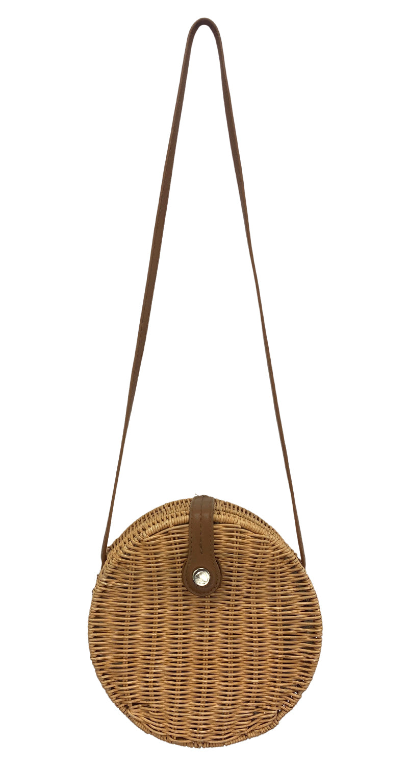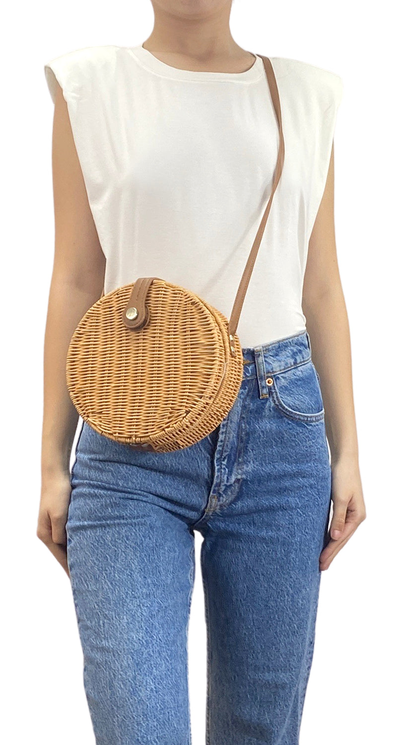 Bandolera de mimbre redonda con correas de ecocuero y botón de broche a presión. Medidas: 20 cm de diámetro.