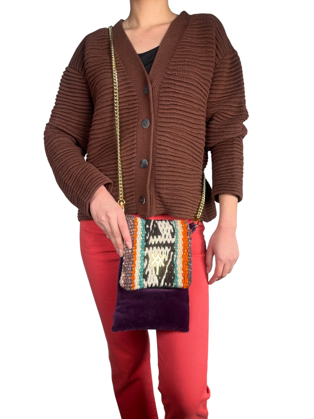 Cuerpo terciopelo 100% algodón. Tejido Andino 100% lana. Medidas 23 x 17 cm.
