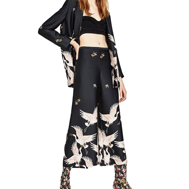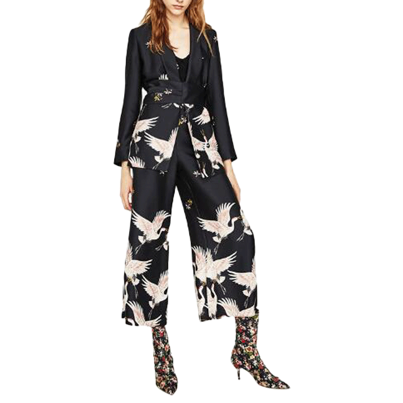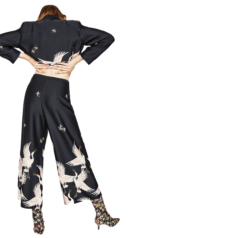 Pantalón Azul con estampado de Pájaros en tonos Rosa, cierre lateral a tono.