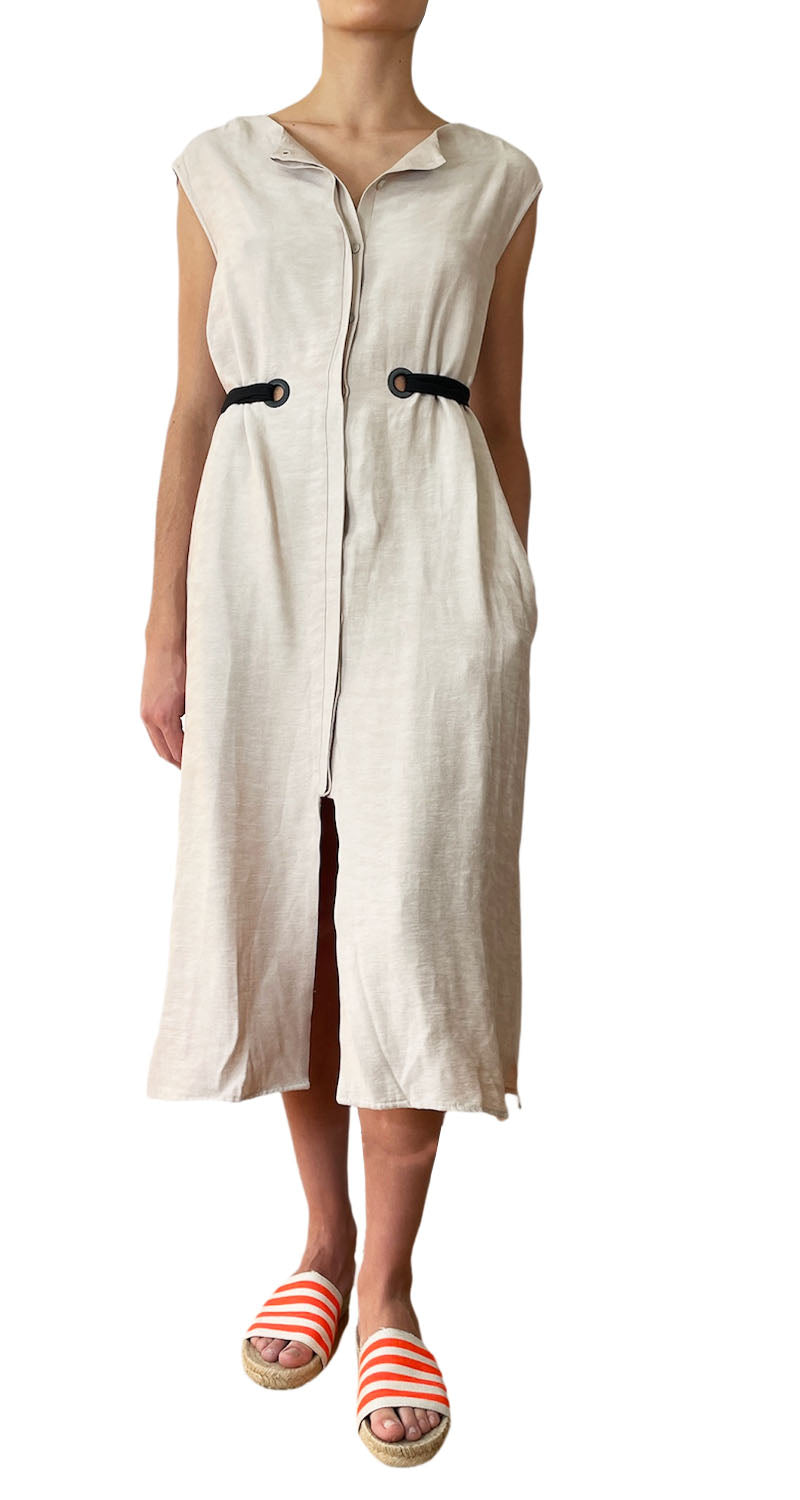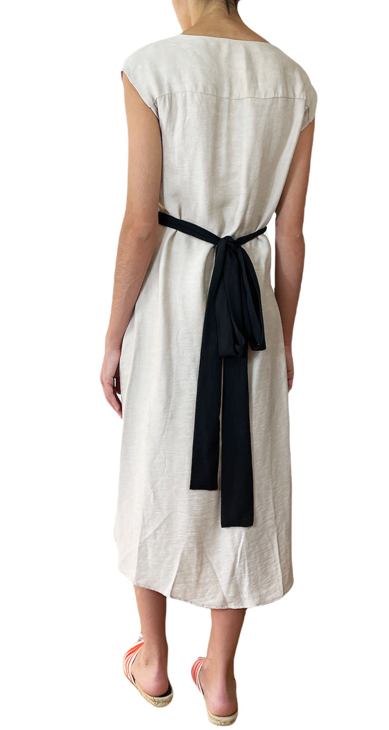 Blusón sin mangas color Beige con tela texturizada y detalle de cintas color Negro en delantero que se amarran en la cintura. Tiene bolsillos en costados.