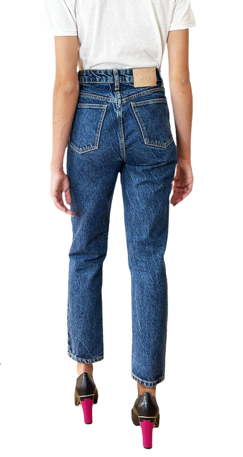 Mom Jeans de denim color Azul Oscuro con efecto deslavado.
