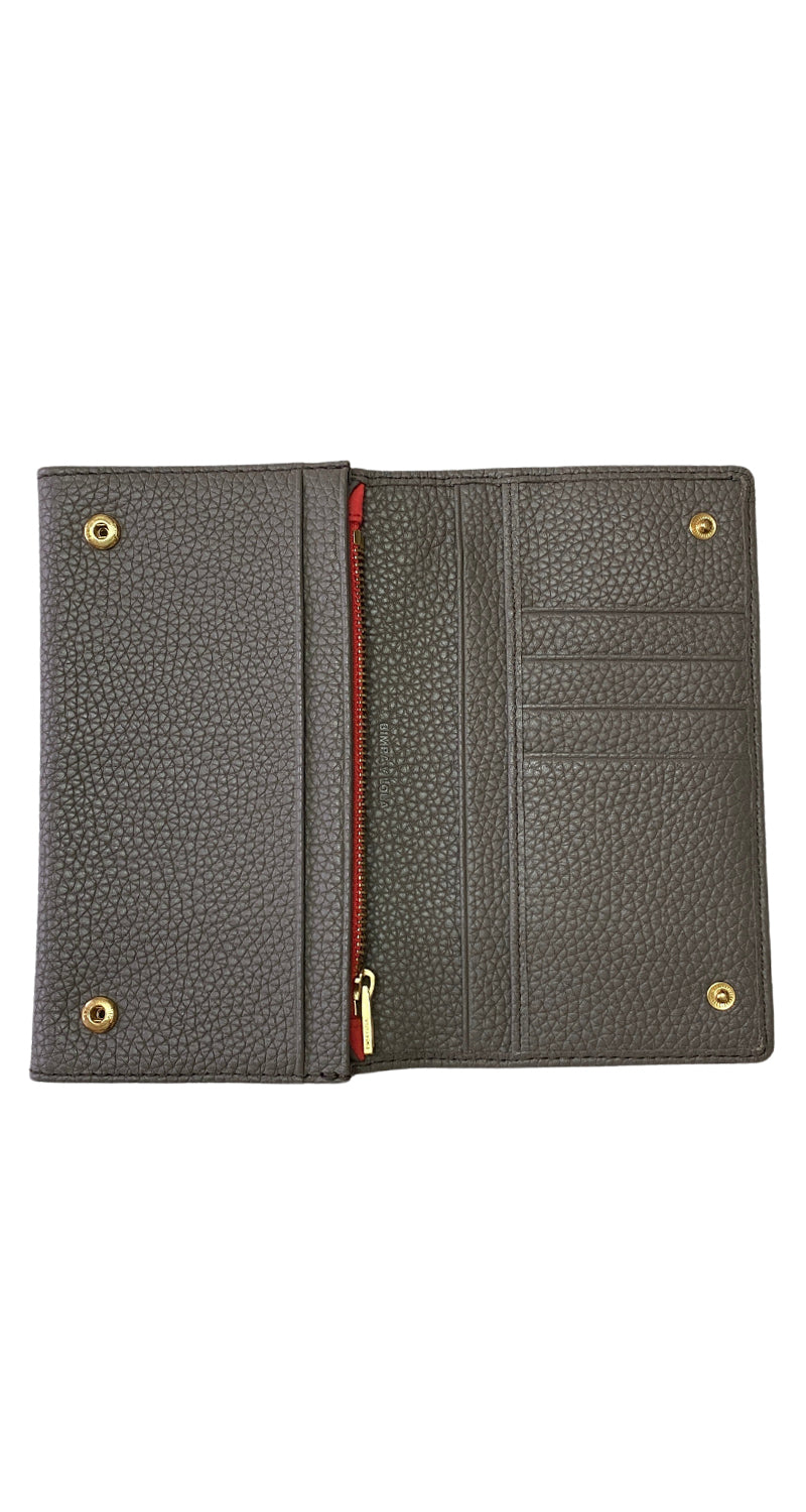 Billetera de cuero color Gris, cierra con broches, múltiples bolsillos al interior. Medidas: 17 x 10 cm.