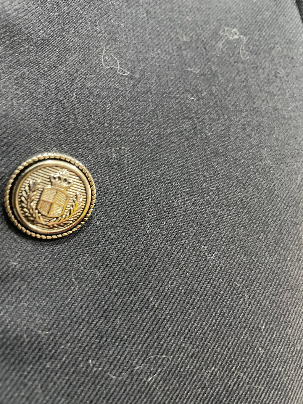 Blazer color Azul Marino, un botón con diseño y tres bolsillos en delantero.