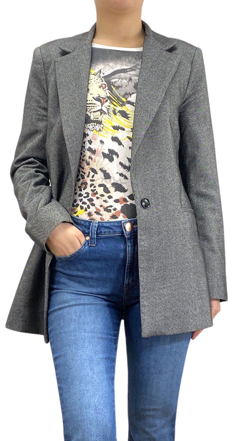 Blazer con patrón de espiga, bolsillos en delantero y cierre de un botón. Talla 36