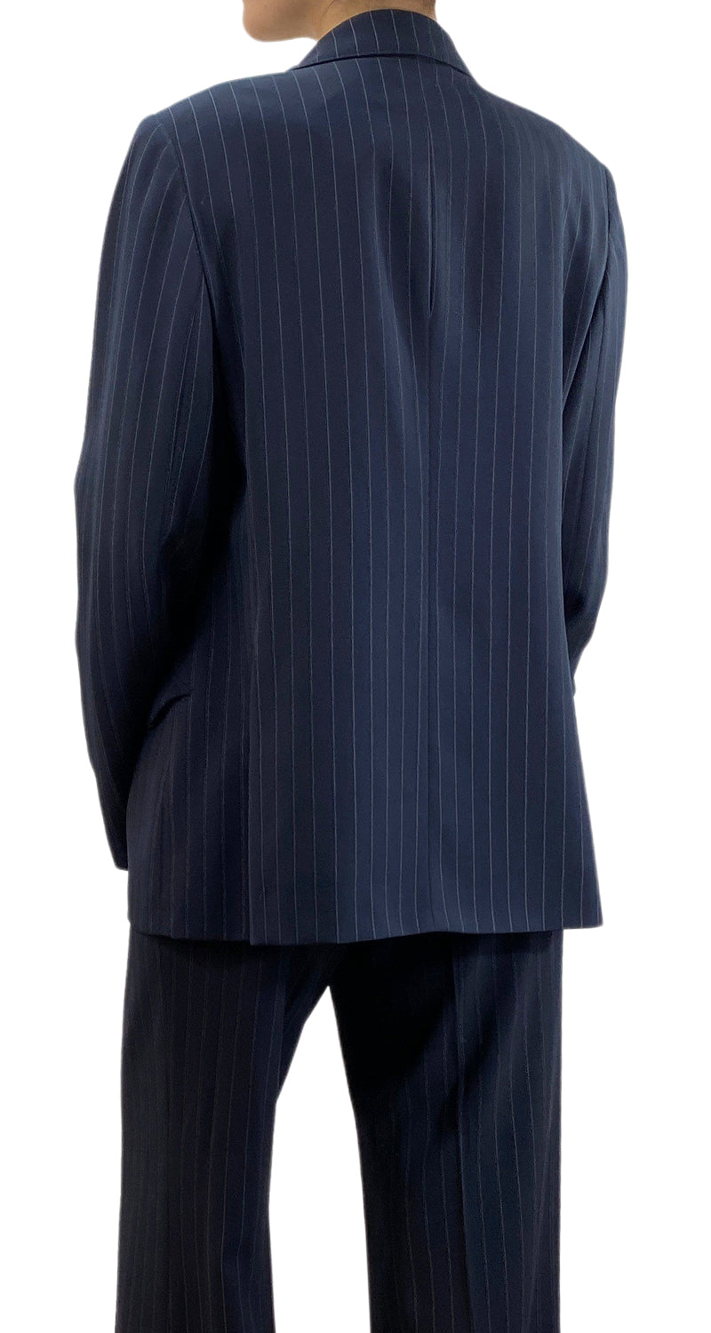 Blazer Azul Marino a rayas, tres botones y bolsillos frontales.