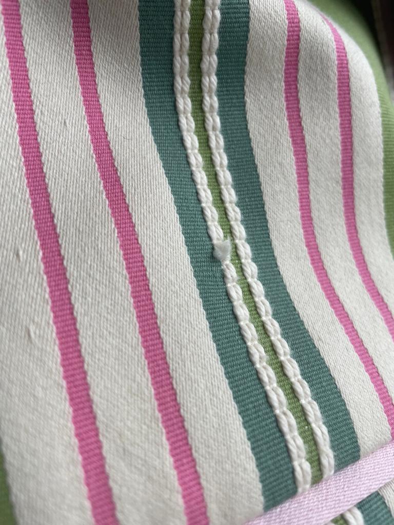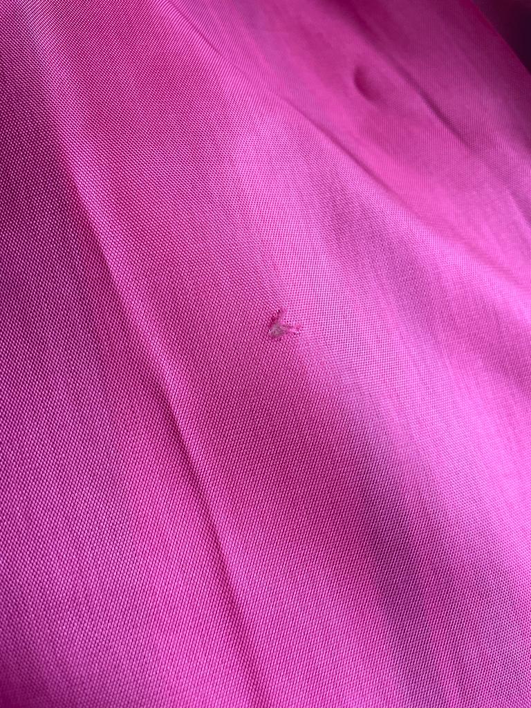 Presenta agujero en forro al interior y punto descosido en delantero.