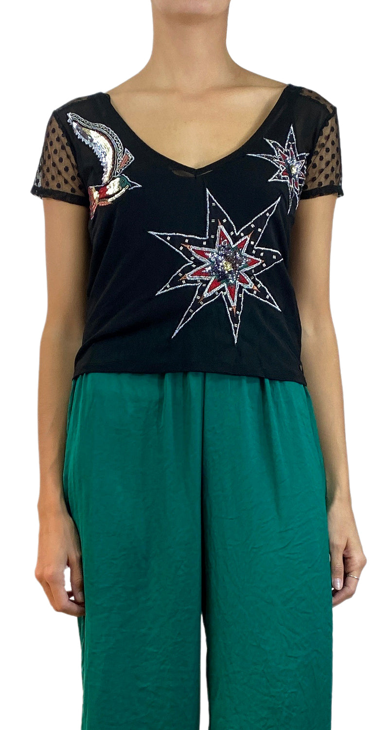 Blusa traslucida en color Negro viene con viso, estampado tejido y con lentejuelas Multicolor, escote en V.