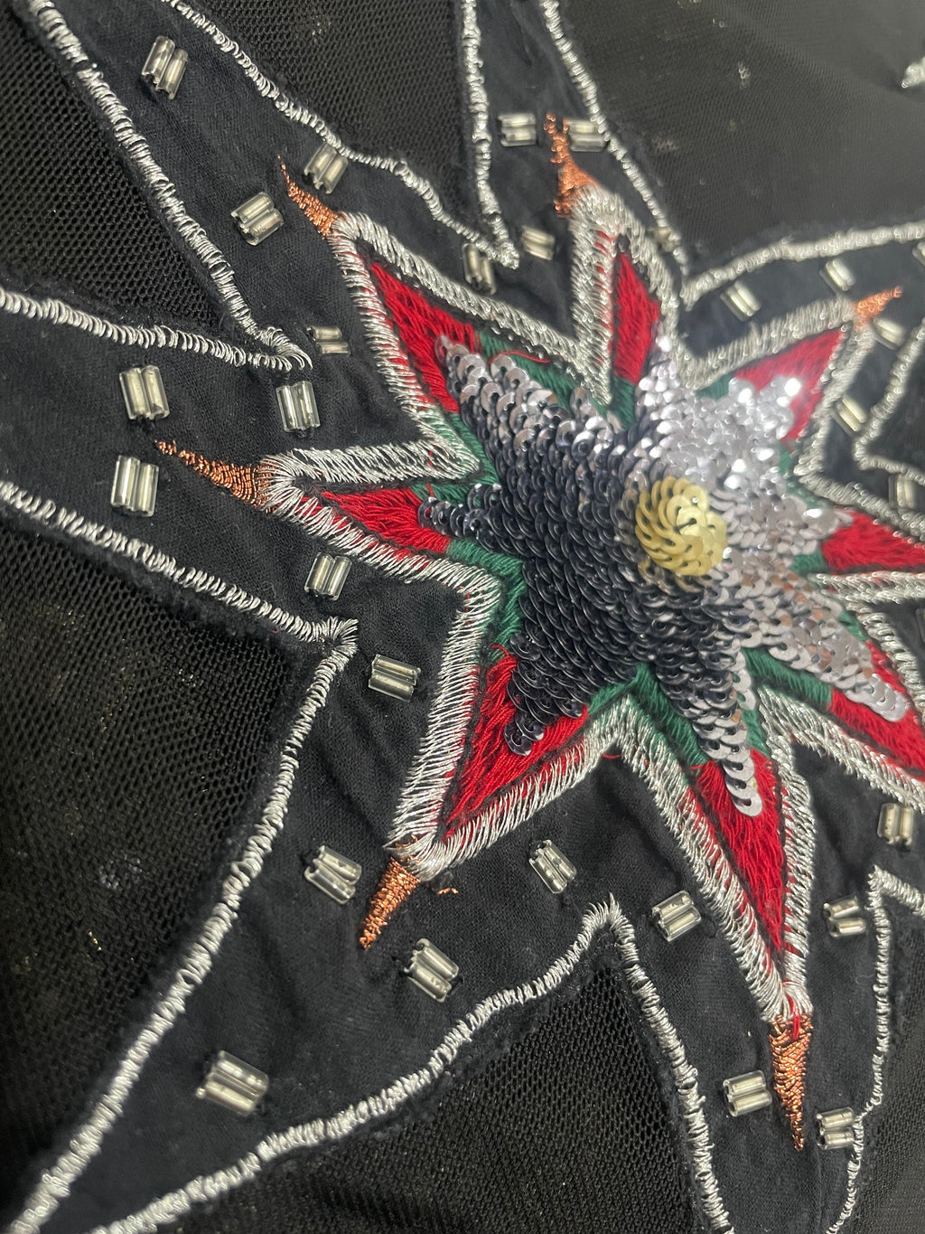 Blusa traslucida en color Negro vine con viso, estampado tejido y con lentejuelas Multicolor, escote en V. No especifica talla.