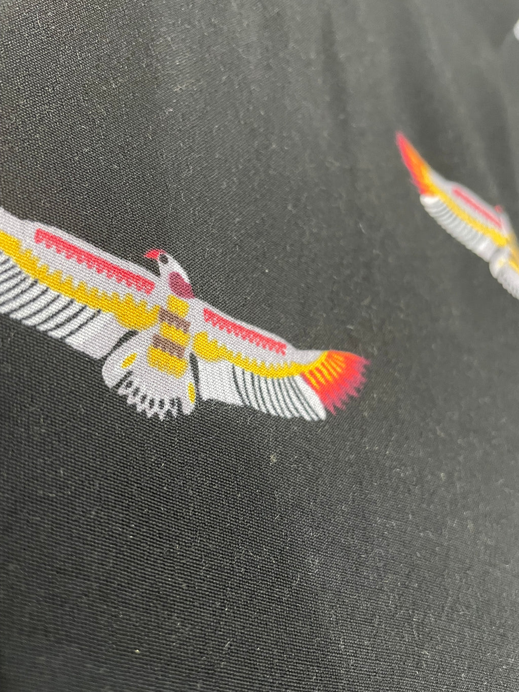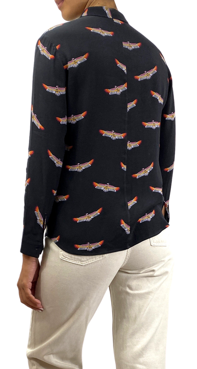 Blusa de botones en delantero, color Negro con estampado de aves Multicolor.