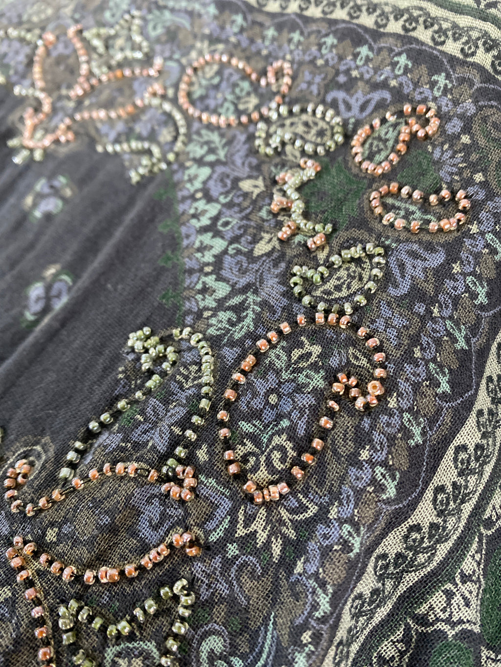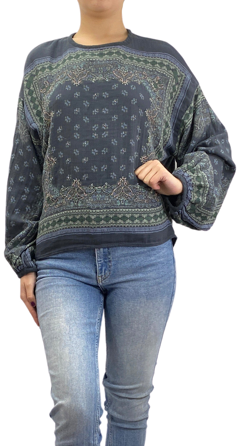 Blusa color Azul petroleo con estampado y bordado de mostacillas.