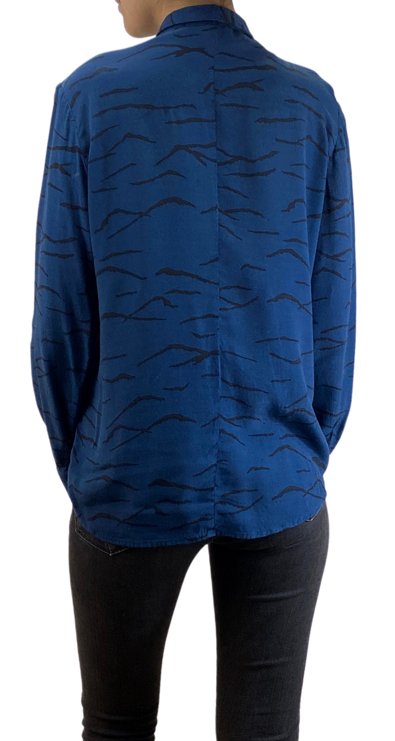 Blusa color Azul Oscuro con estampado en Negro, botones en delantero ocultos.