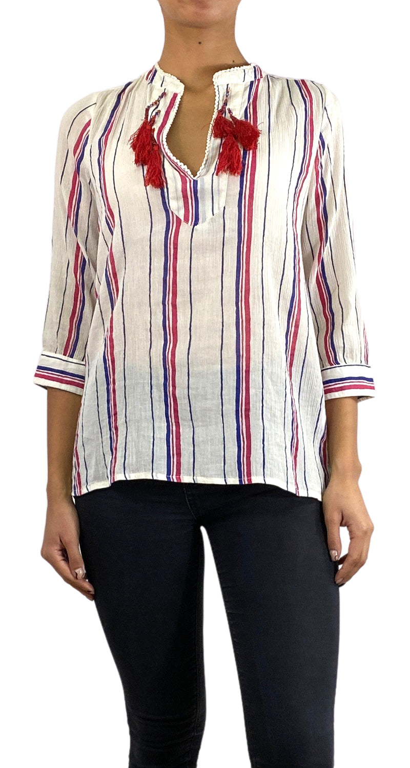Blusa Beige con diseño a rayas y escote frontal en V.