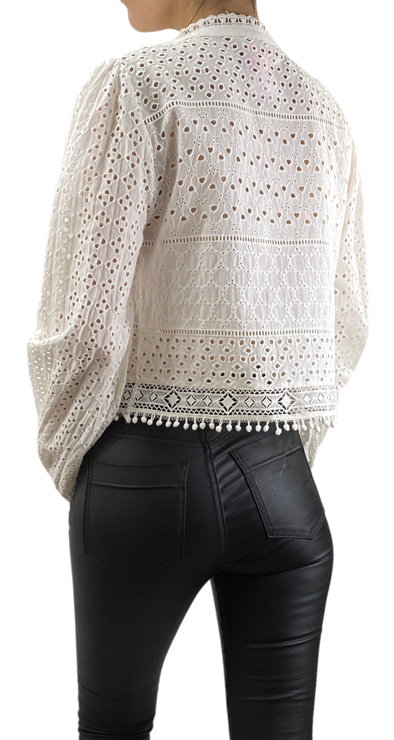 Blusa color Blanco de botones, bordado y detalle de encaje.