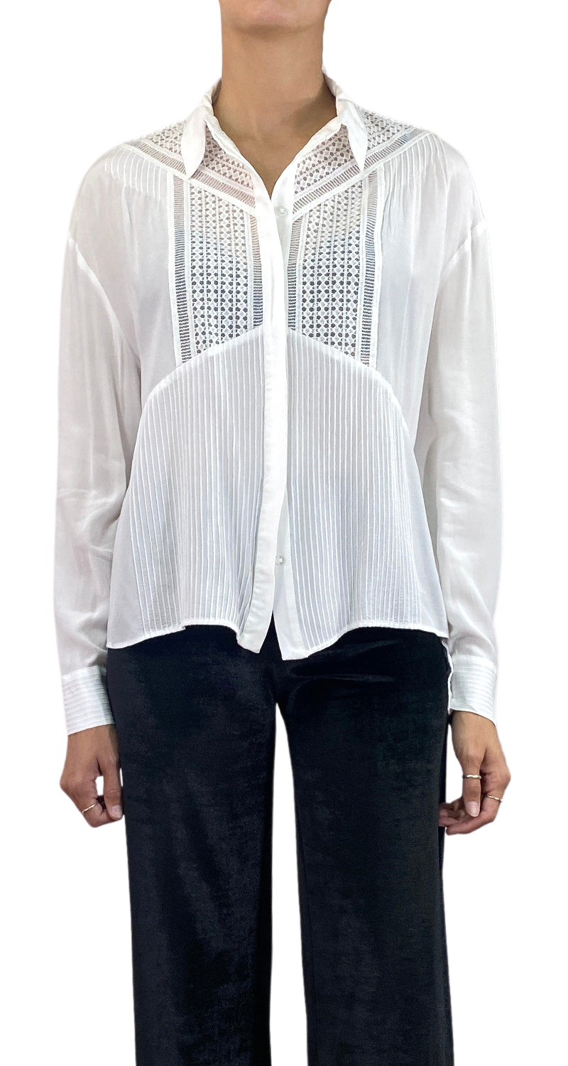 Blusa color Blanco con botones en delantero, cuello americano y tejido macramé.