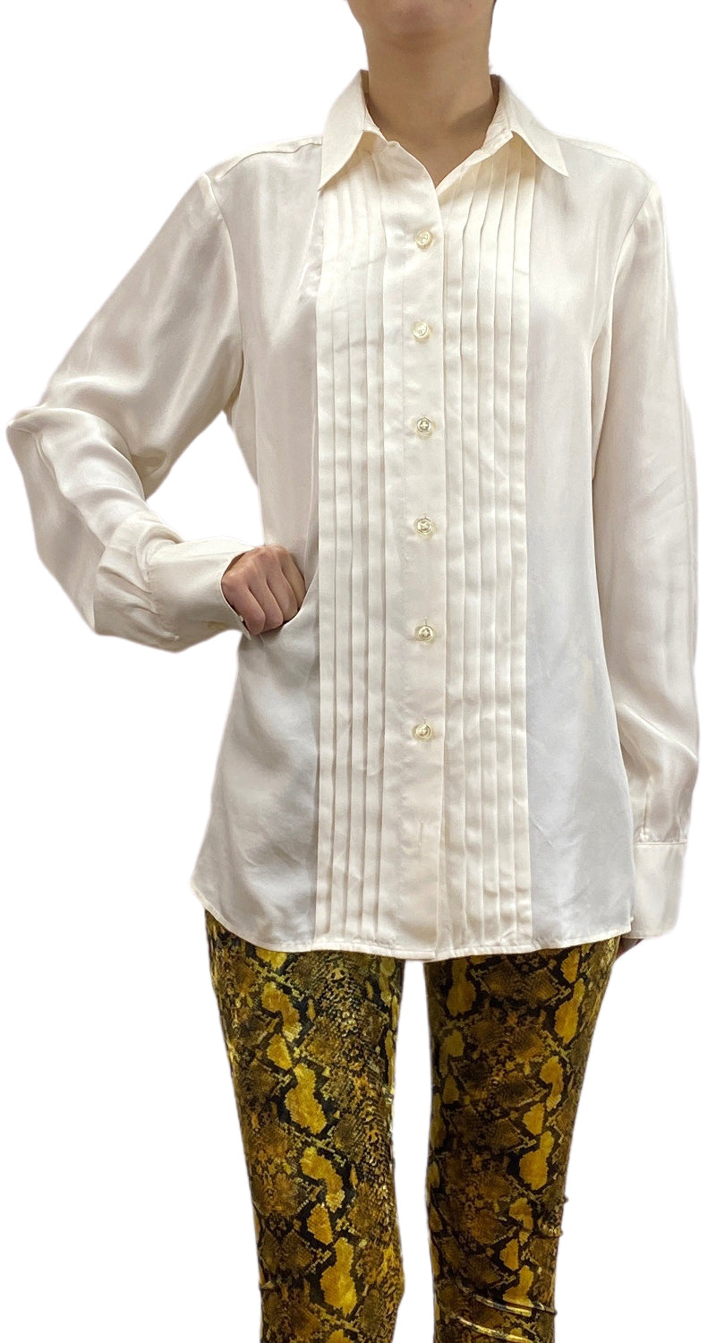 Blusa Blanca de Seda con detalles plisados y botones en delantero.