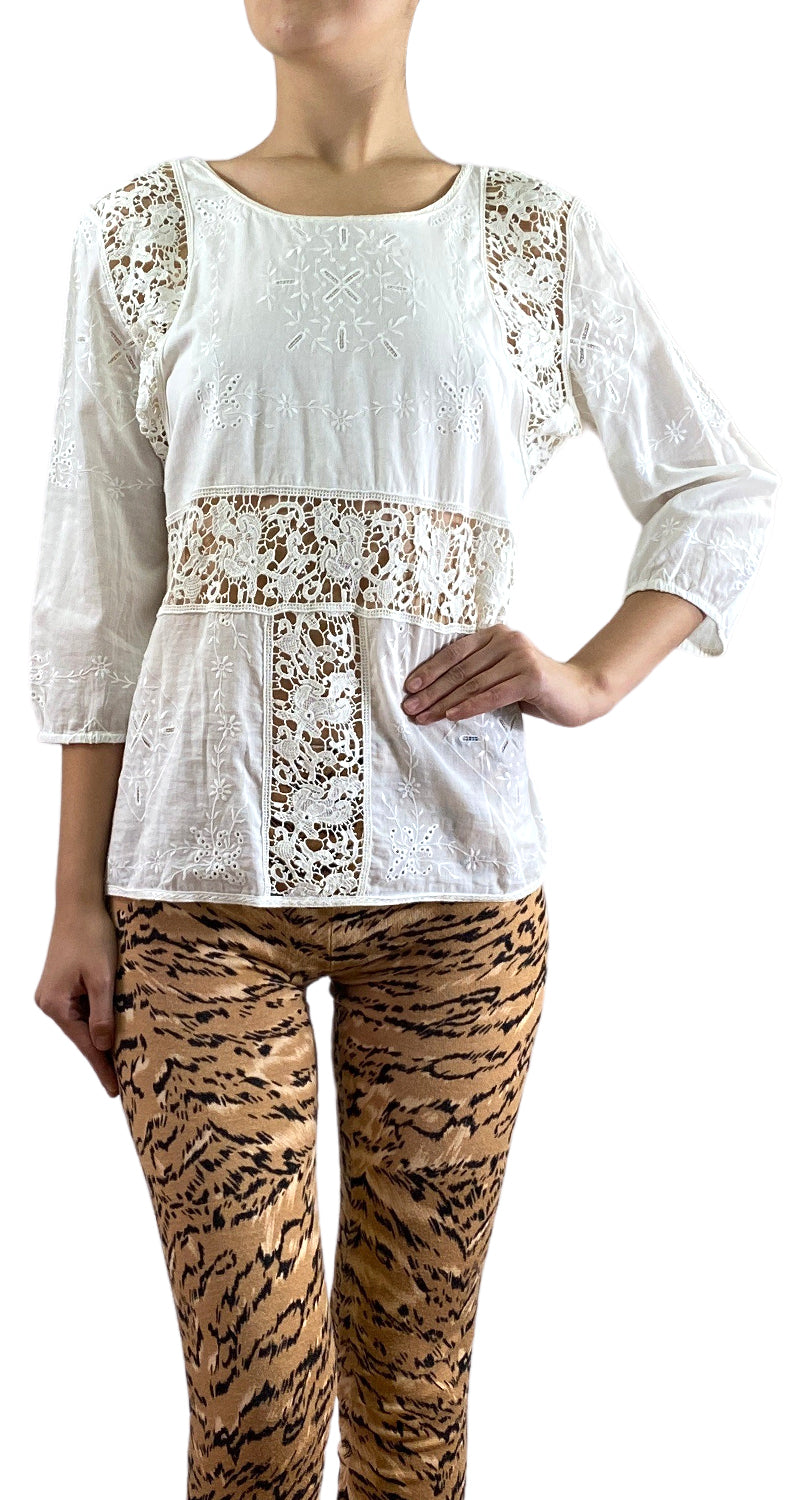 Blusa color Crema con diseño bordado y encajes, mangas 3/4 con elástica.