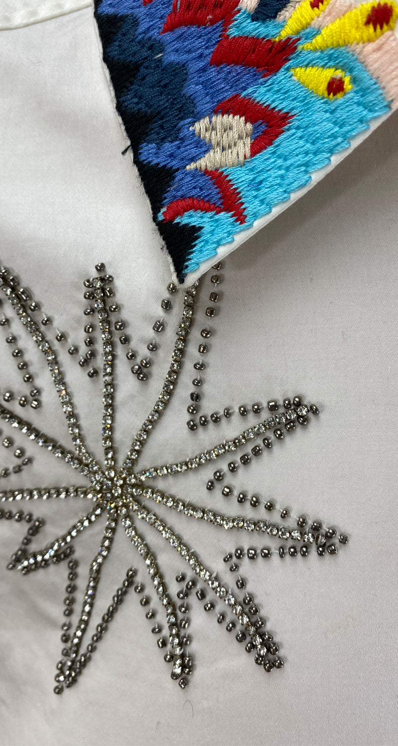 Blusa Blanca con bordado multicolor en el cuello y mostacillas en el delantero. Talla 2 de la marca.