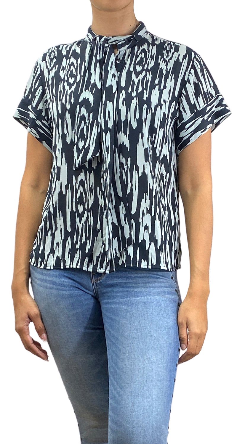 Blusa estampada con diseño de botones y lazo frontal.