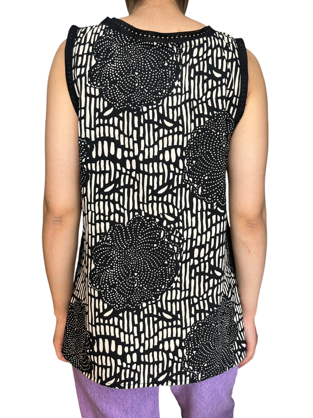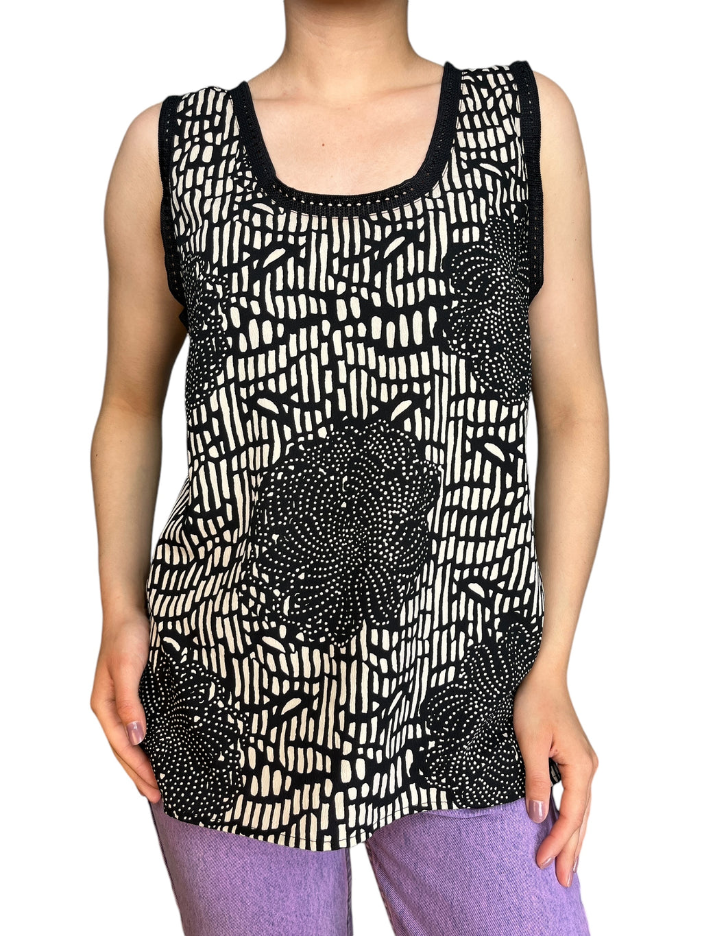 Polera con estampado, color beige, cuello redondo y sin mangas