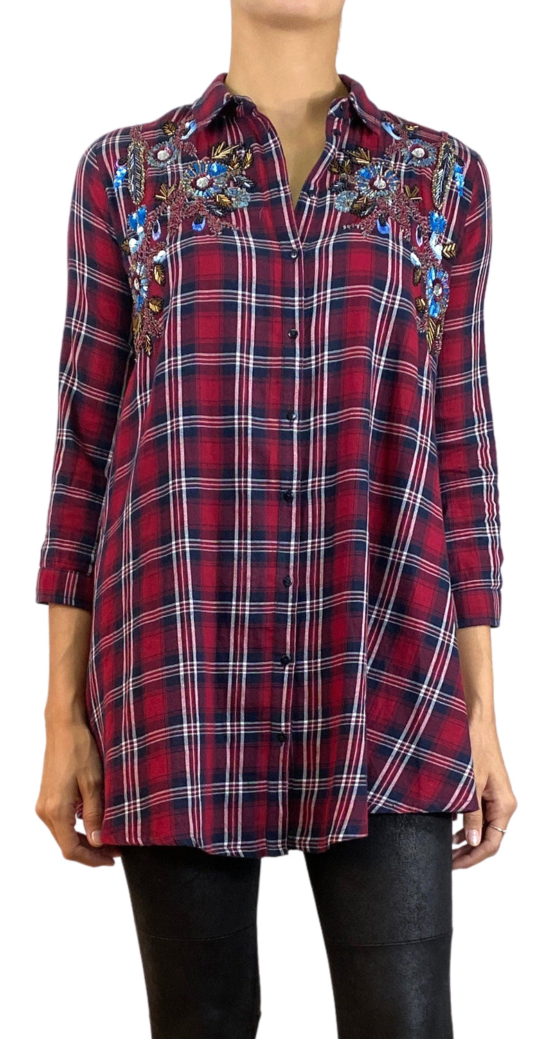 Blusa con estampado Tartan, botones en delantero y bordado de lentejuelas con mostacillas. Altura modelo 1.71.