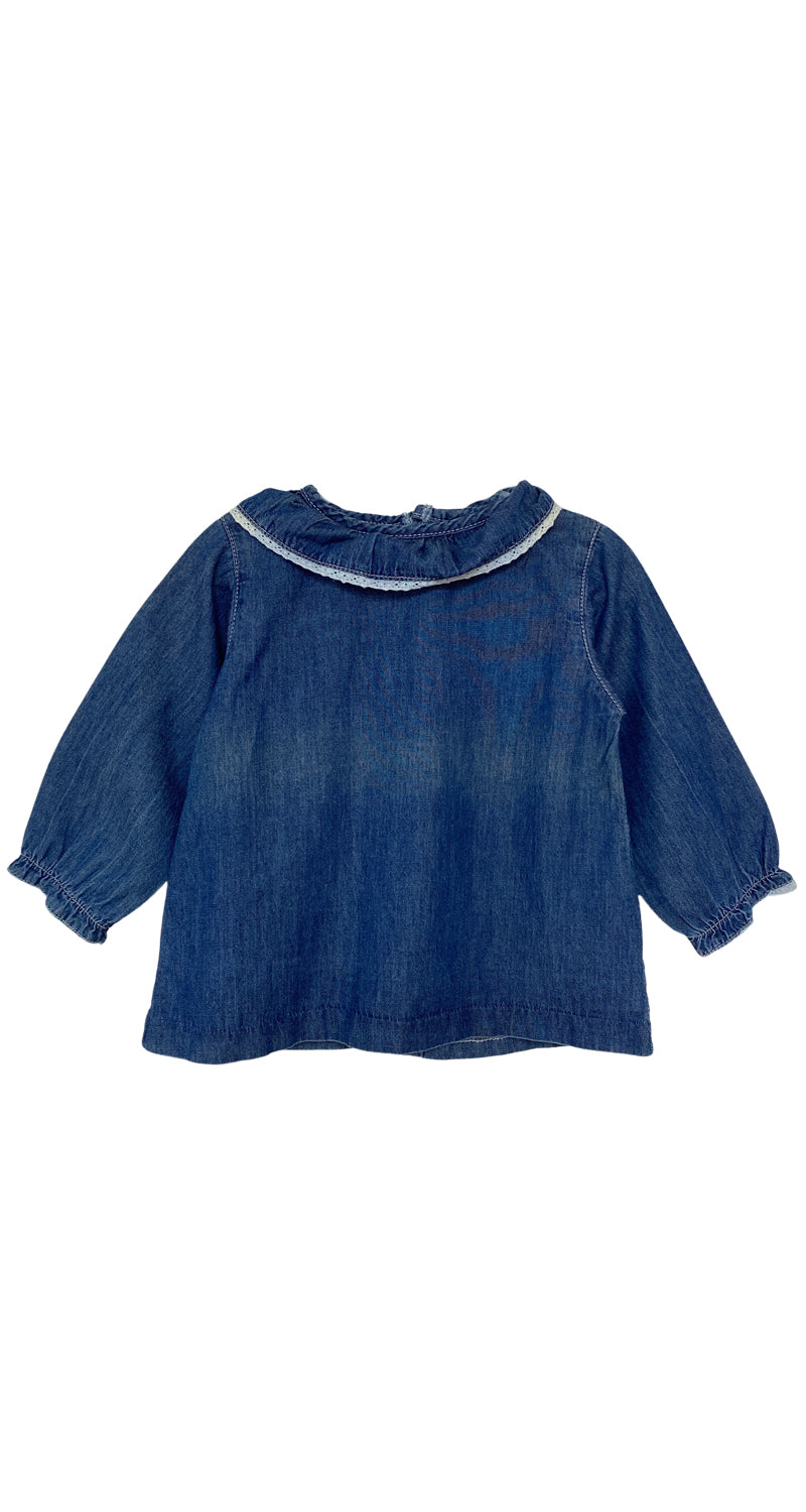Blusa Denim de manga larga abotonada en espalda, cuello rodado con apliqué.